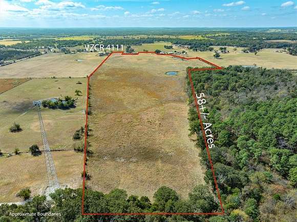 This 58.092 acre property offers abounding opportunities. Currently used agriculturally, it is centrally located near Canton and in the sought after Canton ISD. It fronts VZCR 4111 at two spots while offering the seclusion that might be desired for a private ranch or venue. It could also potentially be used for development. The total acreage is from the combination of two parcels, each having its own pond. There are two gates and a corral making it ready for your cattle operation. The land is currently AG Exempt due to its usage. Electric is available at the road as is water through Little Hope Moore WSC.