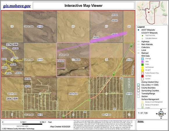 2 parcels just West of Pierce Ferry Rd that total 640 acres. This Ranch property has Miller tank(Cattle tank) on property. Large Utility easement across top of 600 acre parcel. Southern edge has cattle fencing. Primitive road access via N Pueblo Rd. Utility easement access is best physical access and is between MM 15 & 16 on Pierce Ferry Rd. Lat/Long of corners in pictures. Less than a mile off Pierce Ferry, Close to Lake Mead, Colorado River, Grand Canyon West and Las Vegas.