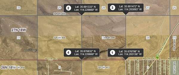 93/new I-11 to N Pierce Ferry Rd to MM 13, N Pueblo Rd. N on Pueblo rd to SE corner of property @ Lat: 35.676798N, Lon: 114.203126W. Fence along southern property edge. Utility easement access is best physical access and is between MM 15 & 16 on Pierce Ferry Rd. Utility easement leads to NE corner of property at Lat: 35.691192N, Lon: 114.203229W