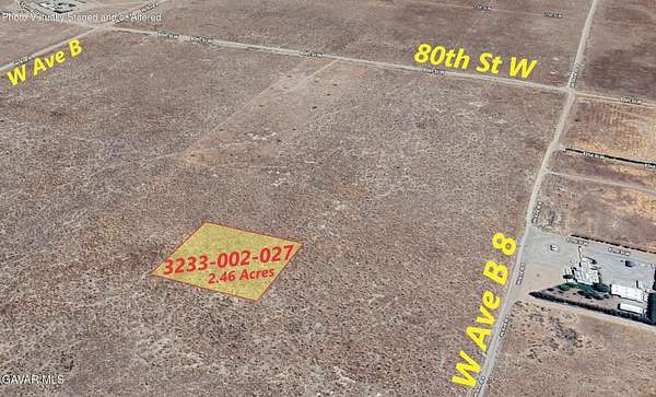 Est $130/moAPN: 3233-002-027Coordinates: 34.800472, -118.2788062.46 Acres for sale in Lancaster, CA. This lot is located near the corner of W Ave B and 80th St W in Lancaster. Other homes nearby in the area as well. The property is zoned LCA12 for agricultural use, per county records.