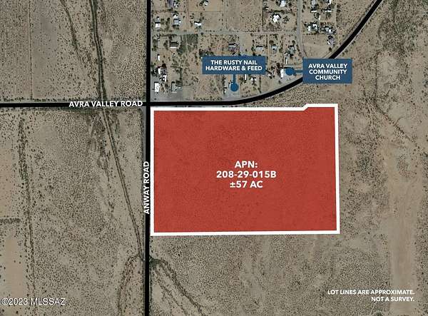 Rare +/- 57 acres in the Marana / Avra Valley AZ area. In the path of growth. Location, Location, Location !!! 57 flat acres on a section corner at the intersection of main east-west arterial Avra Valley Rd and major north-south paved Anway Rd in the fast growing Avra Valley / Marana areas. Zoned RH (Rural Homestead) in Pima County. Many possible uses with electricity along the western boundary and level, easy to develop land. Commercial potential with businesses across the street. Develop an Equestrian business etc. Easy direct access to Marana, I-10 and Tucson. Near proposed future I-11 alignment. Great Investment / Speculative Buy. Seller will allow time for a re-zoning if wanted by Buyer. Detailed Marketing package available. See virtual tour for a birds eye view!