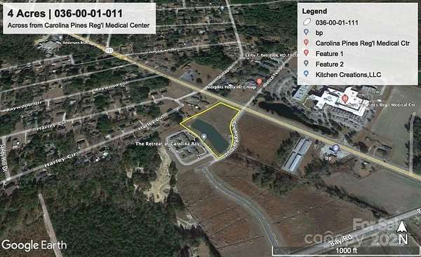 Popular & well traveled thoroughfare accommodating beach traffic from NC to the coast of SC, the Hartsville school system and highly regarded medical resources being adjacent to the Carolina Pines Regional Medical Center/Hospital, across the street from medical offices and directly in front of The Retreat at Carolina Bay Assisted Living Center. Easy ingress-egress being located with traffic light access from W Bobo Newsome Hwy & Carolina Bay Boulevard across from Medical Dr. This 3.95 cleared level tract is comprised of 2.35 AC upland area with a 1.6 AC retention pond. City water & sewer located @ site. This location feeds well to travelers giving you an opportunity to provide your necessities to all commuters. It also bodes extremely well to add additional medical resources with the new Bay Road Elementary School being within walking distance and Hartsville Middle School being only a 1/2 mile away. The popular Neptune Waterpark also contributes to this desirable Hartsville location.