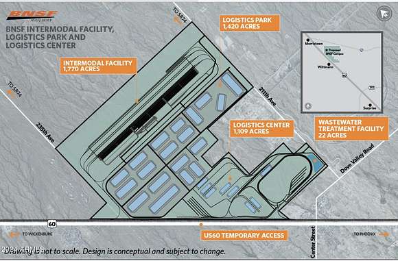 089,090,091,092) is 660 ft. from pavement and less than a mile to the US60. No flood or Luke Zone issues. Not many nice land parcels close to Hwy 60 remaining and close to the BNSF Logistics Hub which makes it a great investment opportunity. Don't miss out on this pristine acreage with endless possibilities. The land is high ground with 4 buildable lots. It has a new 2024 well and is serviced by APS. Newly built homes are to the north and south of the property. It is zoned as residential; site built or manufactured is permitted. The property is not in the flight path or noise contour. SELLER MAY FINANCE
