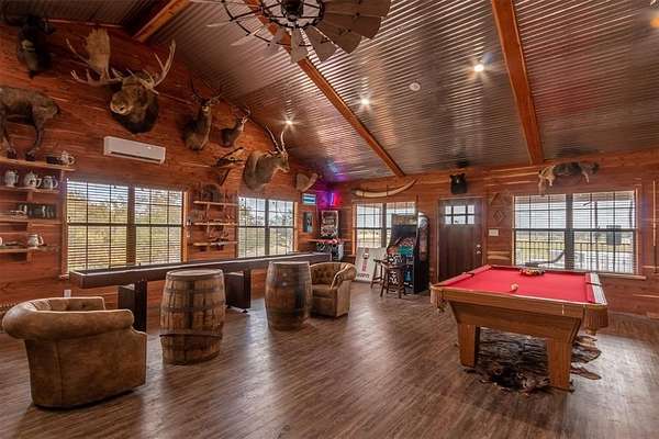 The property features a 5,000± sq ft main residence (built in 2020) with 5 bedrooms, multiple living areas, office, and an entertainment-ready game room. Outdoor amenities include a resort-style pool with slide, grotto, hot tub, and cabana with outdoor kitchen. Additional accommodations include a 3,200± sq ft guest house, seven rental cabins, and multiple staff residences—creating diverse income potential.