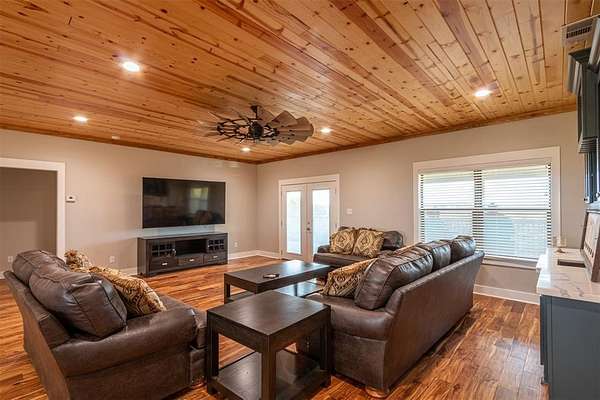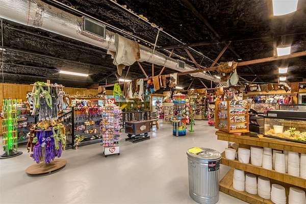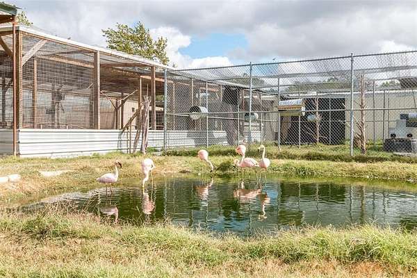Improvements are extensive and purpose-built, including a gift shop, reptile house, bird enclosures, barns, shop, hay storage, and well-maintained roads across a high-fenced and cross-fenced ranch. The property is supported by three electric wells, five ponds, and a wet-weather creek.