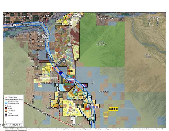 Discover wide-open space and breathtaking mountain vistas with this expansive 160-acre parcel in Maricopa County. Bordering both State and BLM land, the property offers unmatched privacy and tranquility. Ideally situated near the proposed and alternate alignments of the I-11 corridor, it presents significant long-term development and investment potential.