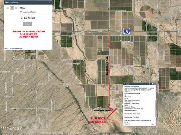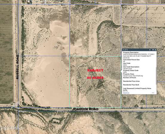 With Tractor Supply, Kohler, CCP Group, Lucid Motors plant doubling in size, Attessa Motorsports Park underway, the town of Casa Grande is expecting 20,000+ NEW JOBS! That's the town's population growing by it's current population. Where will everyone live? *DON'T MISS YOUR CHANCE TO INVEST AHEAD OF GROWTH**This property is just south of Interstate 8 between Russell Road and Montgomery Road full Diamond Interchange. Mountain Views! Close to Proposed I-11 Corridor! Just south of Casa Grande - only an hour to Sky Harbor, Phoenix & Tucson! Russell Road paved from Hwy 84 to Arica Road. Located in a prime farming area. Power adjoining property along east and south. General Rural zoning. Adjoining 40 Acres to west also available.(Check with listing Agent)