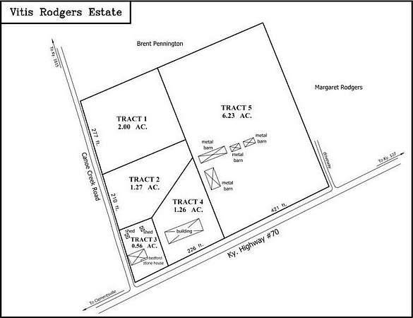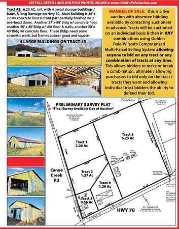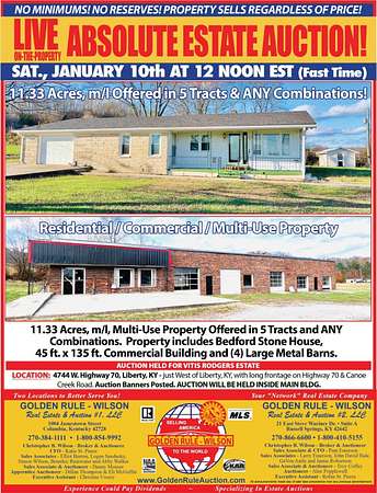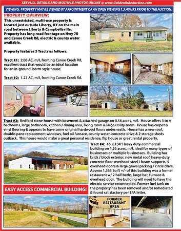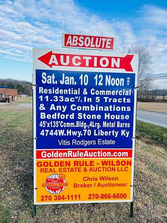 Tract #4: 45' x 134' Heavy duty commercial building on 1.26 acres, m/l, ideal for many types of businesses or multiple businesses. Building has brick / block exterior, new metal roof, heavy-duty concrete floor, overhead steel I-beam supports, 5 overhead doors & large gravel parking / circle drive. Approx. 1,365 Sq ft +/- of this building was a former restaurant w/ 2 half baths, large bar, furnace & overhead door. The building will need to have the electric service reconnected. Former fuel tank on the property has been removed and/or remediated & found satisfactory per EPA letter. ----- This is part of a LIVE ON THE PROPERTY - ABSOLUTE ESTATE AUCTION --- SATURDAY, JANUARY 10th at 12 NOON EST (Fast Time) --- No Minimums! No Reserves! Property Sells Regardless of Price! ---The price indicated does not represent a minimum or maximum amount, it is a nominal amount required for MLS posting. ---- Auction Held for the Vitis Rodgers Estate. ---- PROPERTY OVERVIEW: This UNRESTRICTED, multi-use property is located just outside Liberty, KY on the main road between Liberty & Campbellsville. Property has long road frontage on Hwy 70 and Canoe Creek Rd, electric & county water available. ---- VIEWING: Property may be viewed by appointment or an open viewing 1.5 hours prior to the auction --- MANNER OF SALE: This is a live auction with absentee bidding available by contacting auctioneer in advance. Tracts will be auctioned on an individual basis & then in ANY combinations using Golden Rule-Wilson's Computerized Multi-Parcel Selling System allowing anyone to bid on any tract or any combination of tracts at any time. This allows bidders to make or break a combination, ultimately allowing purchasers to bid only on the tract / tracts they want and allowing individual tract bidders the ability to defend their bid. SEE FULL TERMS & DETAILS at our Company Website. Remember the date SATURDAY, January 10th, 2026 at 12 NOON EST (FAST TIME) at the property!