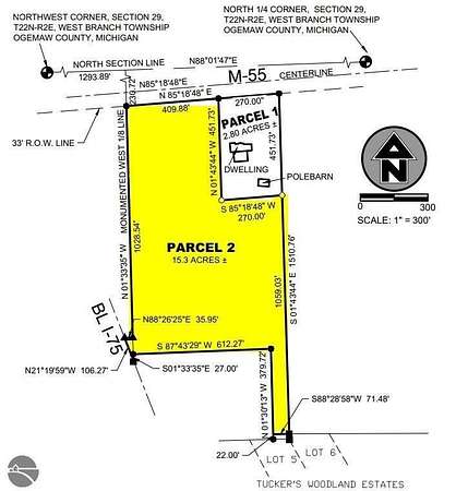 Est $3,935/moPossible commercial usage ~ this 15.3 plus acres fronts both M-55(409.88 frontage) and M-76/I-75 Business Loop (106.27 frontage). Property is located in the West Branch Township Urban Mixed Use District. Sewer and water available on both sides. Great spot for possible multi family dwellings or multiple type commercial/business use.