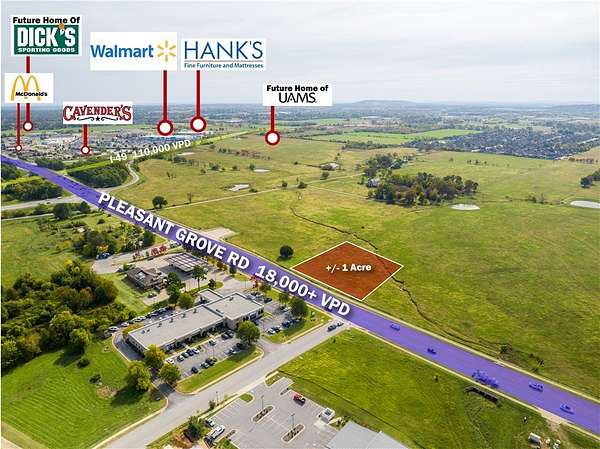 Exceptional Site Development Opportunity! +/- 1 acre of prime commercial land just off I-49 in Rogers. This highly visible site offers direct access from Exit 81 and boasts full utility access-water, sewer, and gas at the street, and electric on site. The current site plan is preliminary; shape, size, and access are subject to change and can be tailored to suit the end user. Surrounded by top national retailers -Walmart, Starbucks, Chick-fil-A, McDonald's, Academy, Ross, and a future Dick's Sporting Goods-this location is ideal for high-traffic commercial use. Traffic counts reach +/- 110K VPD on I-49 and 18K on W Pleasant Grove Rd. Perfect for restaurants, QSRs, pharmacies, coffee shops, banks, and general retail. Just 2.5 miles to Top Golf and Walmart AMP, 10 minutes to Walmart's new HQ, and under 20 minutes to XNA. UAMS is building next door, and Schuber Mitchell Homes plans +/- 520 units nearby. Avg. household income within 1 mile is +/- $170K-driving growth at this dynamic location.
