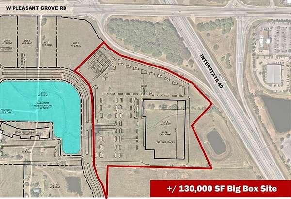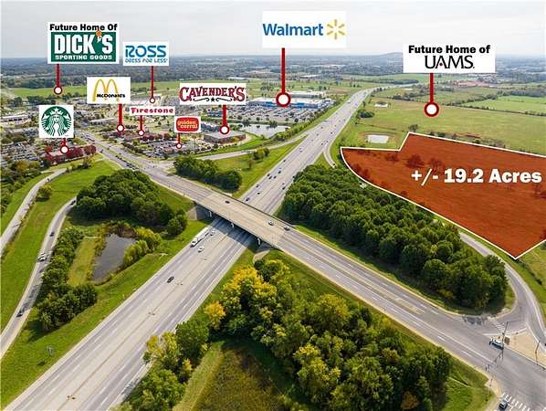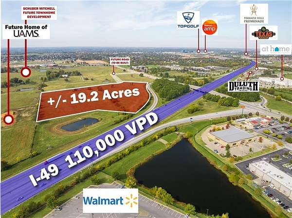 Exceptional Site Development Opportunity! +/- 19.2 acres of prime commercial land just off I-49 in Rogers, AR! This highly visible site offers direct access from Exit 81 and boasts full utility access, with water, sewer, and gas available at the street and electric available on site. Surrounded by top national retailers such as Walmart, Starbucks, Chick-fil-A, McDonald's, Academy, Ross, and a future Dick's Sporting Goods, the property is ideally positioned for high-traffic commercial use. Traffic counts reach approx. 110,000 VPD on I-49 and 18,000 on W Pleasant Grove Rd. Ideal spot for retail, big box, grocery, and more. Located just 2.5 miles from Top Golf and Walmart AMP, 10 minutes from the new Walmart World HQ, and less than 20 minutes to XNA. Additionally, University of Arkansas for Medical Sciences (UAMS) is building a new facility directly next to this site, and Schuber Mitchell Homes is set to develop +/- 520 housing units - fueling growth and foot traffic to this dynamic location.