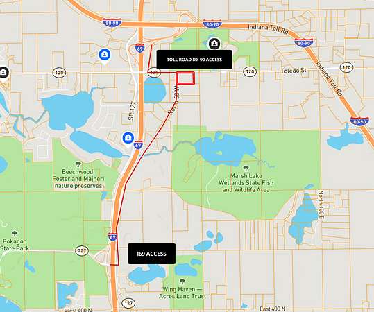 Location: Fremont, Indiana - along State Road 120Access: Minutes from I-69 and I-80/90 Toll RoadFeatures: Partially fenced, level ground, north and west road frontagePotential Uses: Manufacturing, warehousing, freight terminal, logistics hub