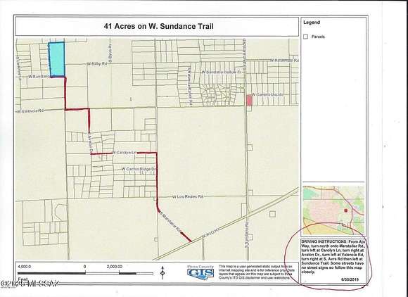 From AJO WAY & SANDARIO RD. drive W to MARSTELLAR RD. RT to CAROLYN LANE, LEFT to AVALON DR, RT to VALENCIA RD, LEFT to AVRA RD, RT to SUNDANCE TRAIL. You're at the SE corner of this 41 acre parcel. Continue WEST to the first dirt road. turn RT on S. SUNDANCE TRAIL. The 41 acres is on your right. Use the dirt trail traversing this lot to see it all.