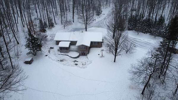 Feel the peace & hear the quiet, hunt from your own back yard or just enjoy the abundant wildlife! This open concept, like new, 2 bed, 2 bath 1540 sq ft. home is nestled on almost 5 beautifully wooded acres & has a great location too! Less than 2 miles to Bass Lake 18 hole golf course, close to many area lakes & snowmobile & ATV trails are accessible without trailering. Relax in the Sunroom or enjoy the screened in patio, walk-out lower level that you can finish or not. 2 car attached insulated garage plus an additional garage, 4 apple trees, 1 plum, & a very nicely landscaped yard. New furnace & hot water heater in 2020, roof is around 9 years old. Central air, Forced air furnace. Wood burner stove in basement & wired for generator hook-up.
