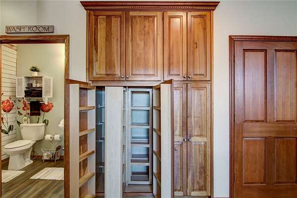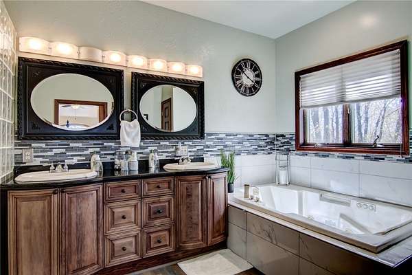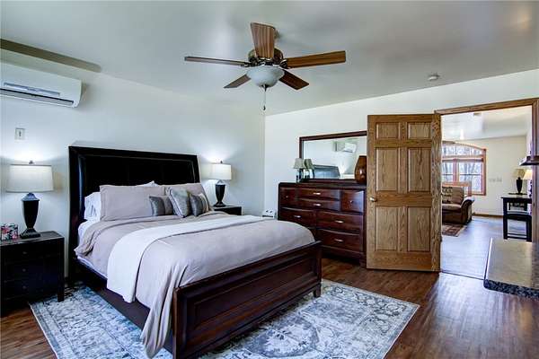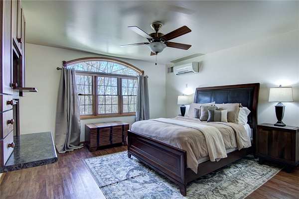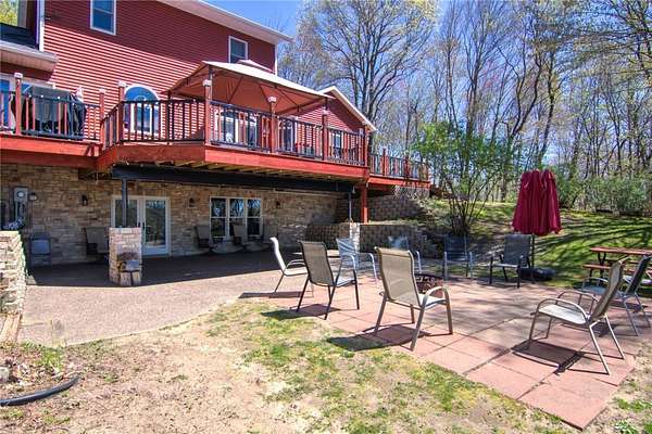 Stunning custom home blending country charm with modern comfort on 22+- acres. The inviting red barn-style exterior opens to warm, elegant interiors featuring a grand stone fireplace. Entertain with ease in the impressive Tuscan inspired lower level complete with a full bar, fully furnished game room, and wine cellar. The main level offers a beautiful kitchen, cozy coffee nook, and walkout to a spacious deck with covered gazebo overlooking peaceful wooded views. The primary suite, also on the mail level, includes a spa-inspired bath with dual sinks and glass block shower. A separate suite is included above the garage where your guests can enjoy privacy and comfort . A rare find offering style, craftsmanship, and serene privacy. More Acreage available., to be surveyed. Buyer/Agent confirm measurements 10 acres plus or minus, with survey