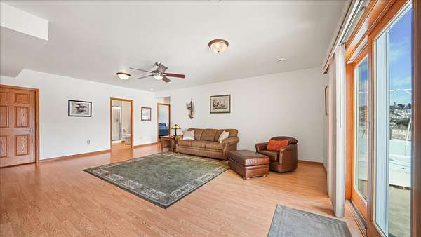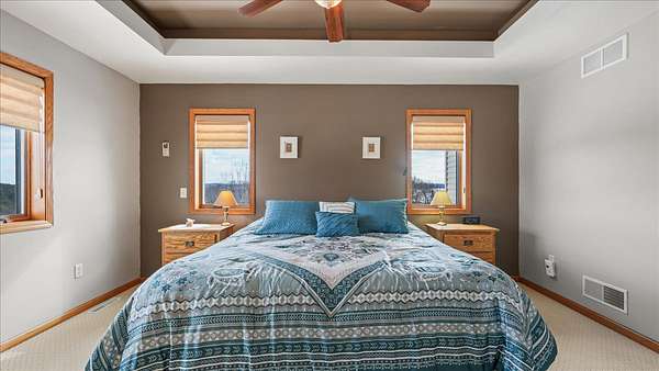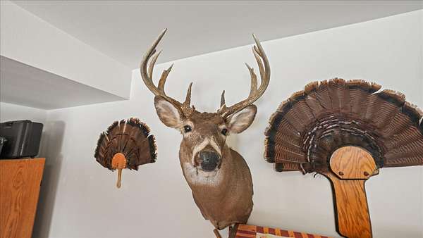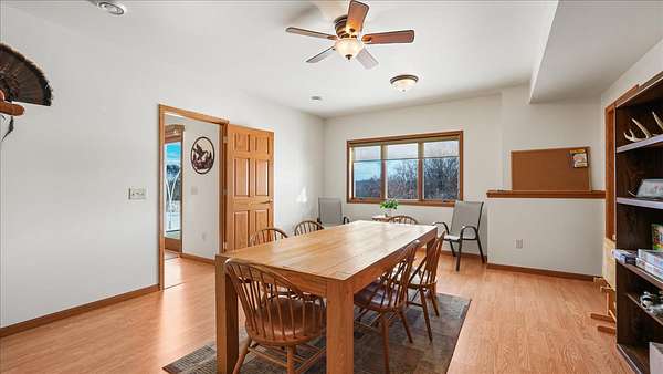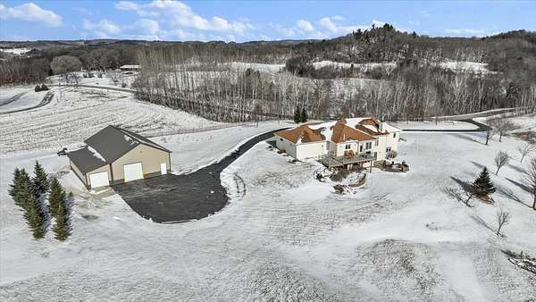 Set high above the rolling countryside of Jackson County, this 36.8± acre executive estate delivers luxury country living, income-producing lands, and exceptional wildlife habitat in one turnkey Western Wisconsin package.The expansive 3500+/- sq ft 4-bedroom, 3-bath executive-style home is strategically positioned to capture sweeping ridgetop views and unforgettable sunsets. The open-concept kitchen features custom hardwood cabinetry, a large walk-in pantry, and a built-in wine bar designed for both functionality and entertaining. A composite deck extends from the dining area, providing uninterrupted elevated views of the surrounding countryside. The vaulted ceilings and an open-concept design of the main living area create an inviting, spacious atmosphere ideal for entertaining and everyday comfort. A natural wood-burning stone fireplace anchors the living space with warmth and timeless character. The large private master suite features its own en suite bath with heated floors, offering a comfortable retreat at the end of the day. The main floor is also home to another bedroom, dedicated office space, and large mudroom laundry area.The walk-out lower level offers another large family room, recreation room, two additional bedrooms, and a full bathroom. Multiple storage and utility rooms, along with direct access from the lower level to the garage, add flexibility for guests, multi-generational living arrangements, or separate activity space.An engineered blacktop driveway leads to both the residence and a large drive-through insulated shop complete with a walk-in cooler—ideal for hunters, hobby farmers, or business owners requiring workspace and cold storage.Outdoors, the 36.8 acres are thoughtfully developed and highly functional. Established clover food plots, income-producing tillable acreage, mature hardwood timber, and native wildflower prairies create diverse habitat and visual appeal. A spring-fed pond provides a year-round water source and further enhances wildlife activity. Well-maintained trail systems allow easy navigation throughout the property for ATV use, hiking, or strategic hunting stand access.Wildlife is abundant and consistent. The property supports healthy populations of whitetail deer, wild turkey, and pheasant, making it equally suited for the serious outdoorsman or the nature enthusiast who values daily wildlife sightings from the back deck.This is more than a home—it’s a fully integrated executive rural estate combining luxury living, recreational excellence, and income potential in a highly regarded Western Wisconsin countryside setting. Conveniently located between Eau Claire and Black River Falls, with easy access to La Crosse and the Interstate 94 corridor, this property offers rural privacy without sacrificing regional connectivity.