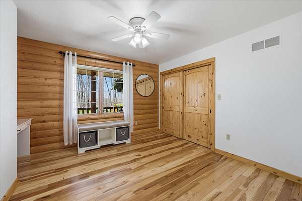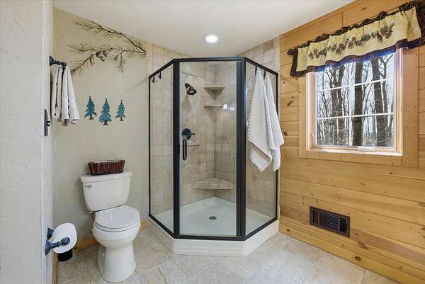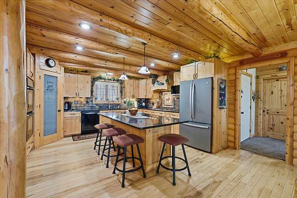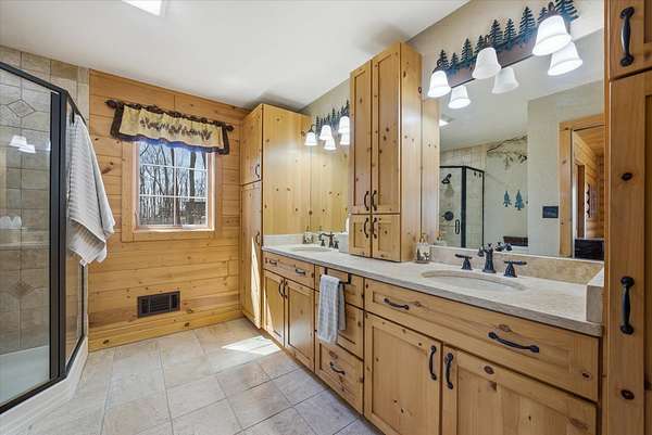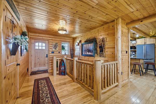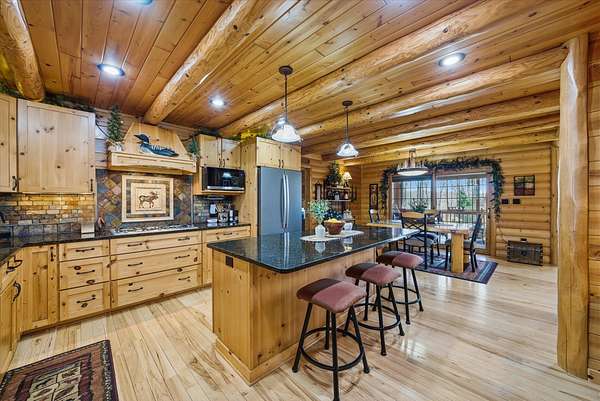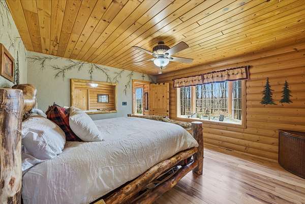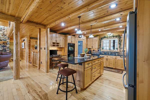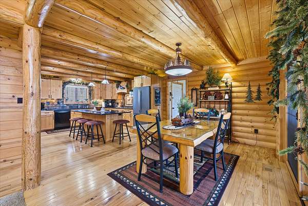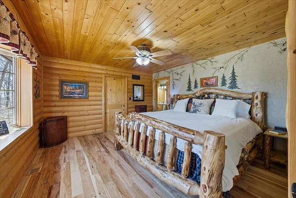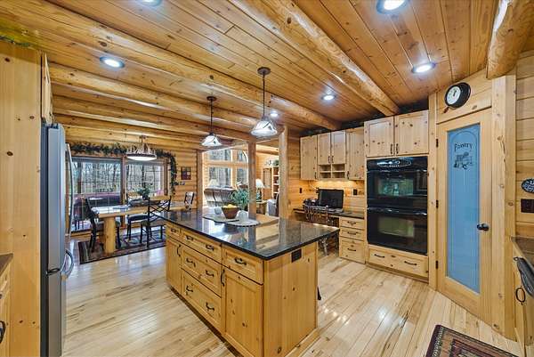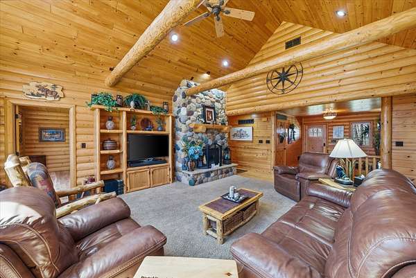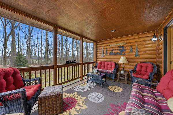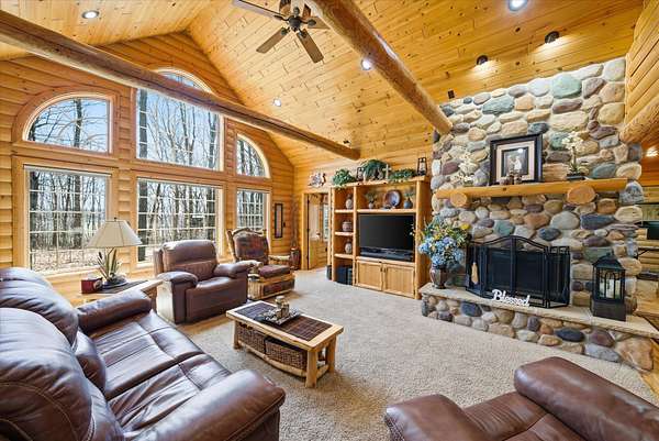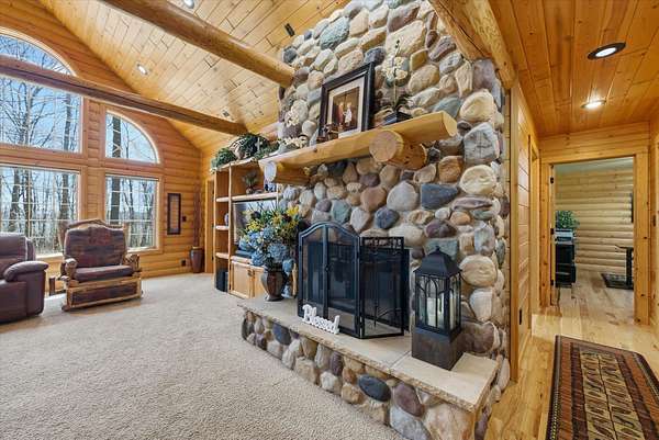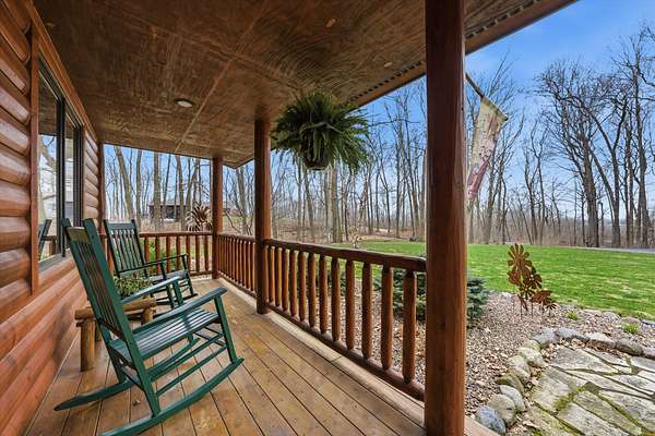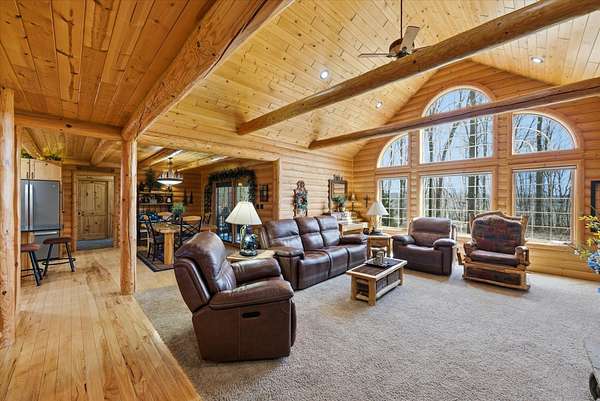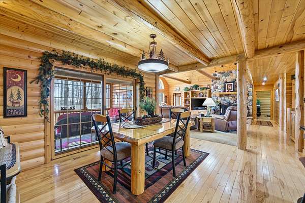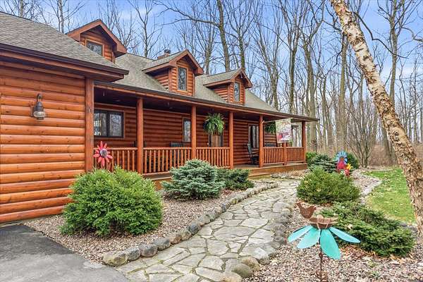 A rare Kettle Moraine beauty--this stunning log cabin rests on 5+ acres, offering a peaceful, private setting for nature lovers. With 4 BRs, 3 BAs, and 2 FP's, the home features a finished walk-out LL complete w/a bedroom, full BA, workshop with walk-out doors, and wet bar--perfect for entertaining or extended stays. The kitchen is anchored by a large island, granite CT, pantry, and abundant storage which flows seamlessly into the dining area & screened 3-season porch--ideal for morning coffee & sunrise views. The primary suite offers new HWFs w/a private BA w/dbl vanity and walk-in shower. A dramatic wall of windows fills the great room w/natural light & sweeping views. Meticulously maintained with a 3.5 car garage, 2 fire pits, solar-lit shed. A retreat designed in harmony with nature.