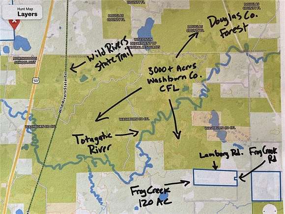 118 acre parcel just east of Minong. The property has a great mix of forest and open area. There are nice stands of pine, along with some mature oak and maple trees. The east section was logged about 15 years ago, and the new growth pines are coming up nicely. There is an existing trail network in place, making the majority of the land easily accessible. The whitetail deer, bear and turkey hunting on the property has been excellent. The land is not in any MFL programs. The property is split into 3 square 40+- acre parcels, with road frontage on two sides, making a future land split a possibility. There are over 3000 acres of Washburn County Forest on the north border. The Togogatic River, a great spot for fishing and paddling, is less than a mile away, and can be accessed from the county land. The Wild River State Trail is just a few miles to the west. Located just over two hours from the Twin Cities, it's an easy drive. Check out this wonderful property in Washburn County, WI!!