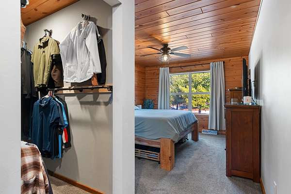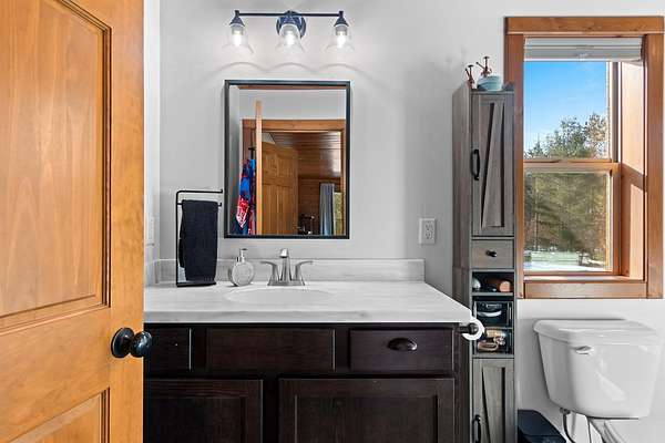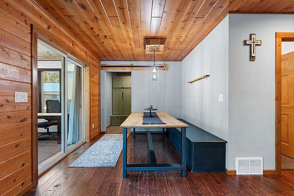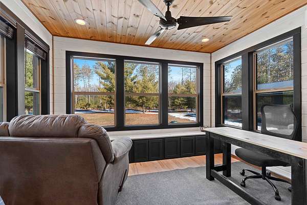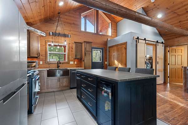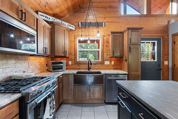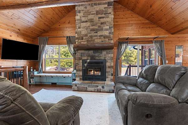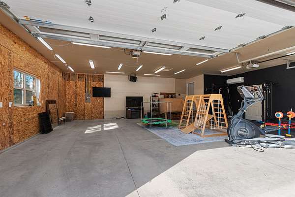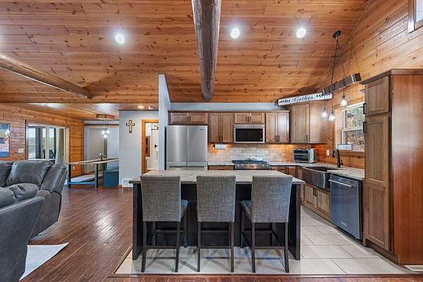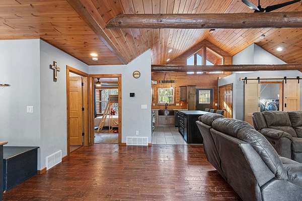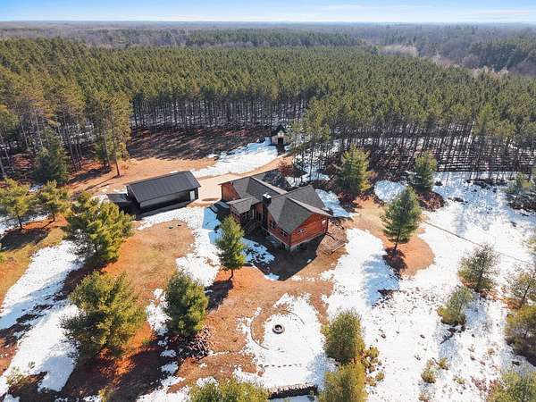 custom-built log home by Golden Eagle Log Homes, nestled on 10 acres. This tranquil retreat features an open-concept layout that seamlessly connects the living room, dining area, and kitchen. The kitchen dazzles with maple cabinets, granite countertops, and stainless steel appliances, while the living room showcases hardwood floors and a floor-to-ceiling stone wood-burning fireplace. On the main floor, you'll find 2 bedrooms and full bathroom, laundry room, and a cozy four-season room that invites sunlight year-round. The finished lower level expands your living space with additional bedrooms, and a spacious family room. Outdoors, enjoy a 3-car heat/AC attached garage plus a 30x40 detached garage and an additional outbuilding currently used for chickens. *LL features exposed floor joists.