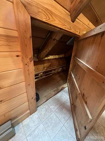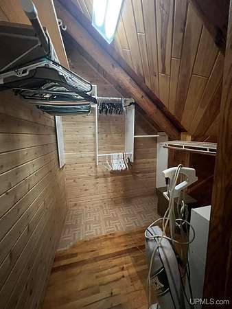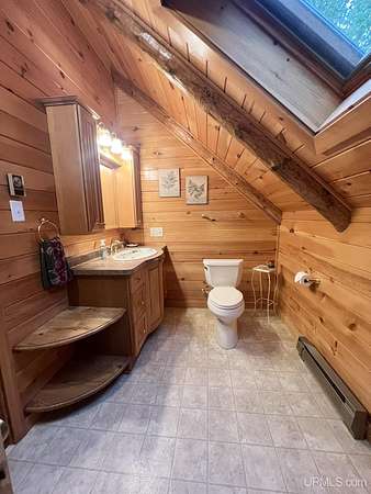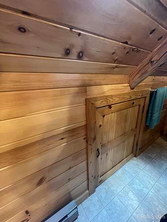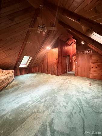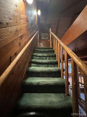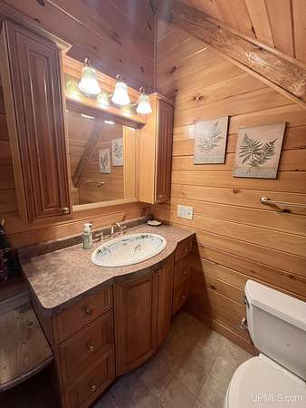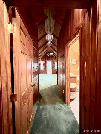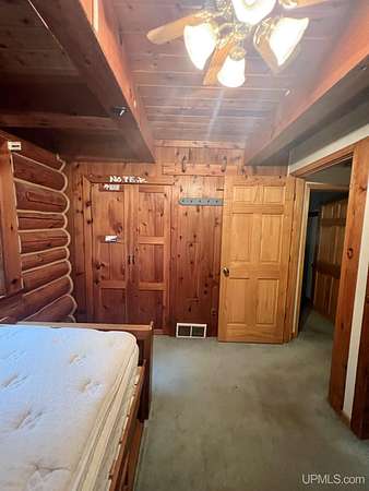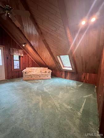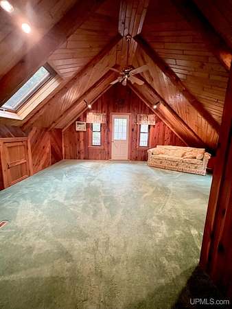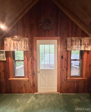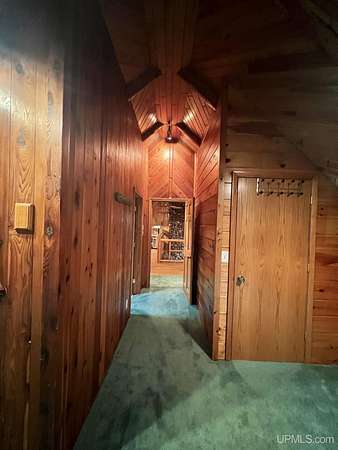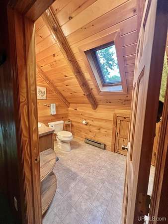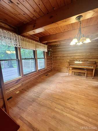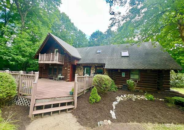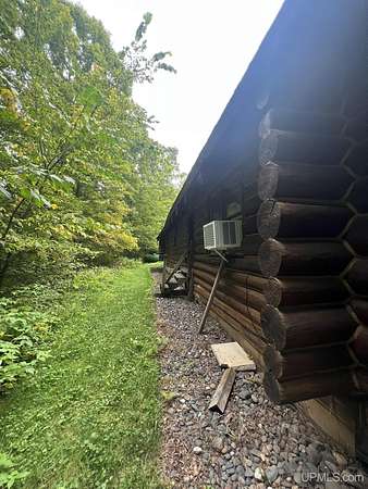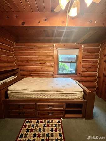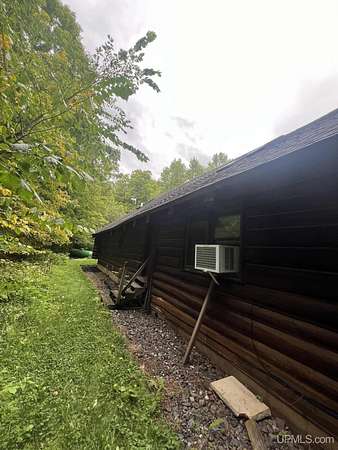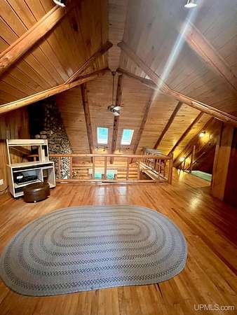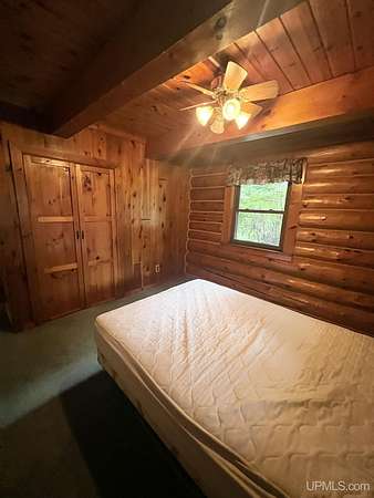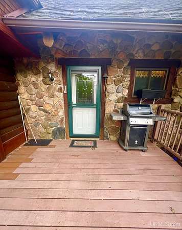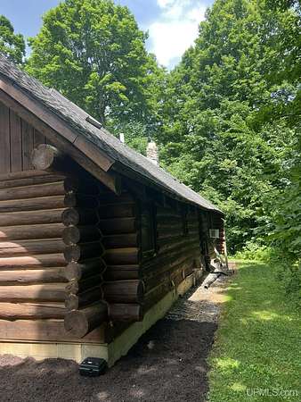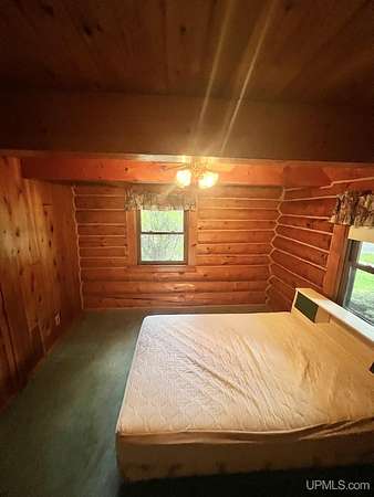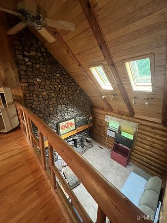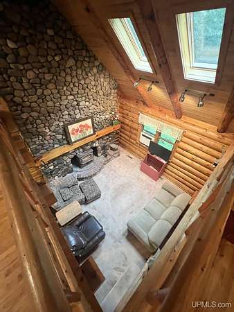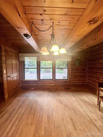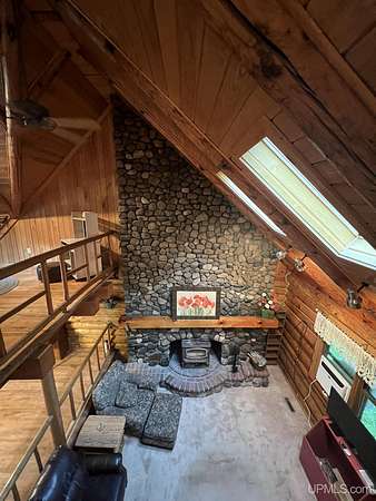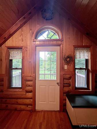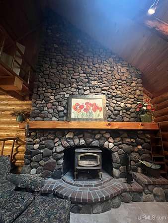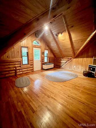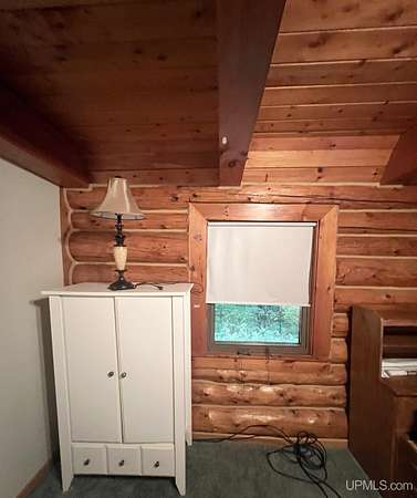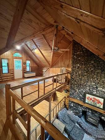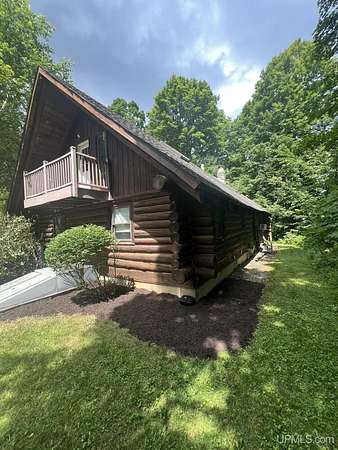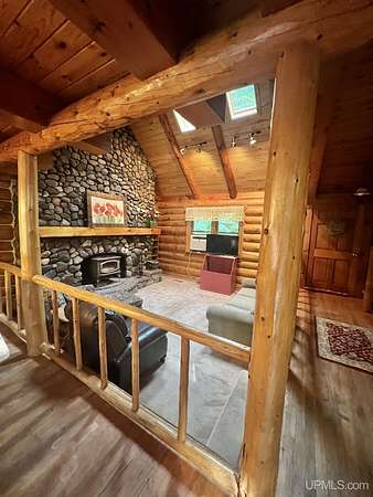 Priced under 2025 appraised value! Follow the private wooded drive over the owned bridge, to this beautiful 3-bedroom, 2-bath log home, perfectly set on 20 acres, near a branch of the beautiful Sturgeon River. The home opens to a landscaped yard and features vaulted wood ceilings, a loft, and a sunken living room/great room with a striking floor-to-ceiling stone fireplace and brick hearth. The kitchen is a true modern rustic standout with Italian tile accents and hand-painted tiles by a local Upper Peninsula artist, complemented by hardwood floors. The main floor includes two large bedrooms, a full bath with laundry, and abundant natural light. Upstairs, the primary suite offers a private balcony, sky lights, custom rustic fixtures, a walk-in closet, and under-eave storage. The loft includes its own balcony overlooking the front yard and V-Lux windows for easy maintenance. Additional features include a two-car detached garage and a pole barn, providing ample storage and workspace possibilities Come view the property with trails on the 20 acres of gorgeous hardwood and mixed species of trees, excellent hunting and fishing opportunities right on your homestead, schools K-12 in walking distance, gas stations, convenience stores and restaurant within minutes and only 20 minutes to Iron Mountain! A property that combines rustic charm with thoughtful updates--a true Northwoods retreat!