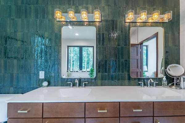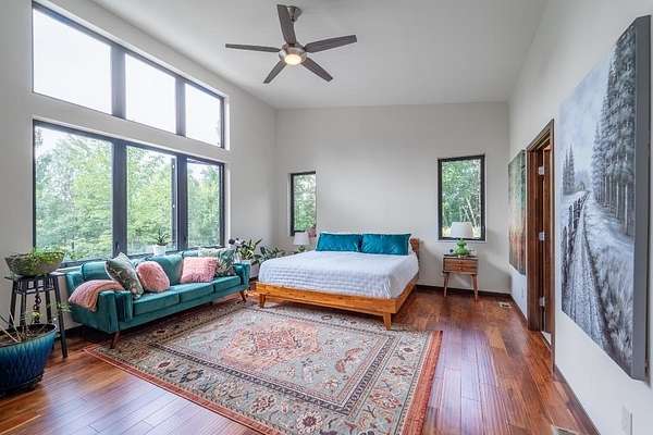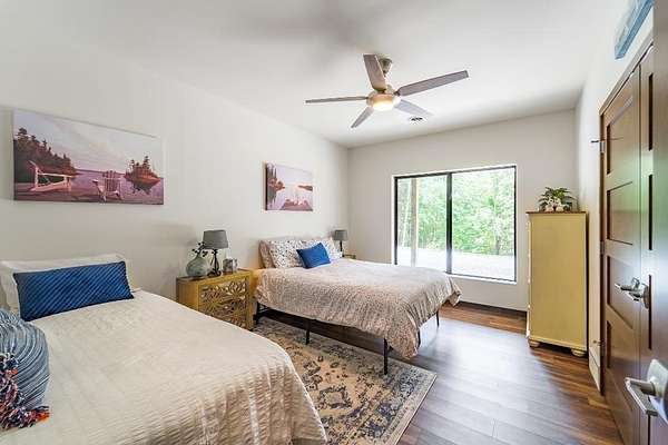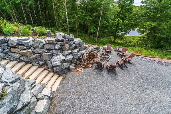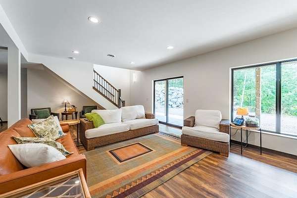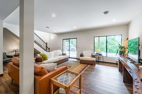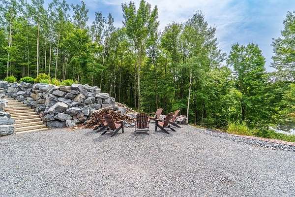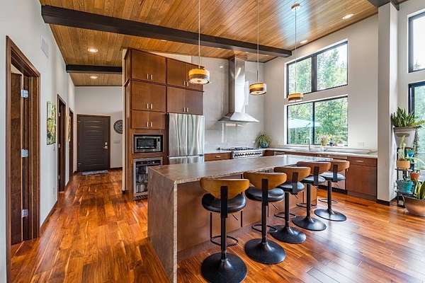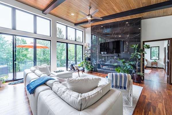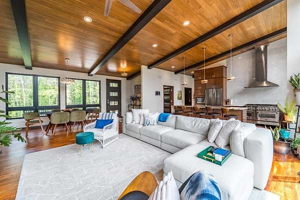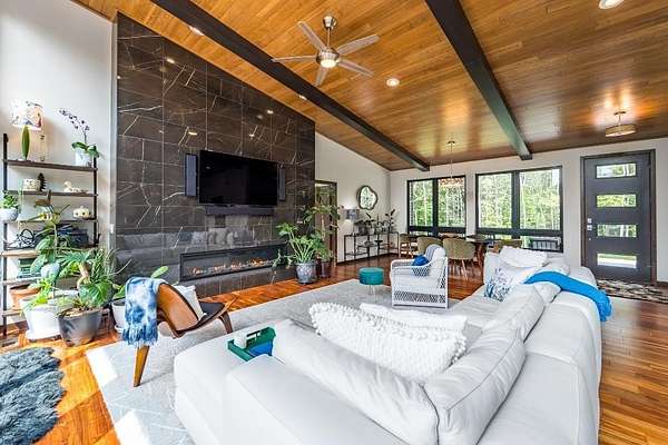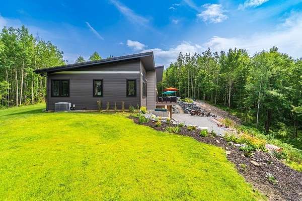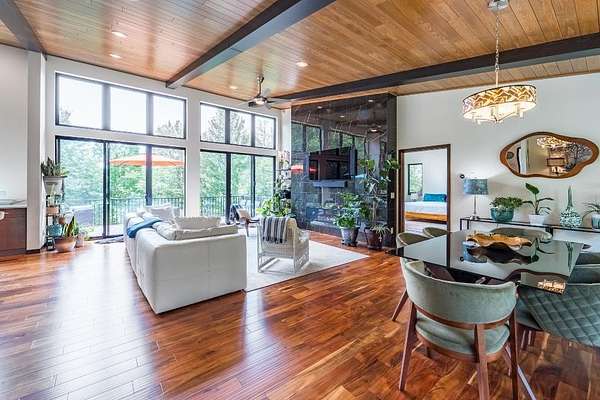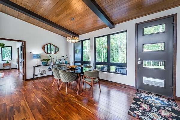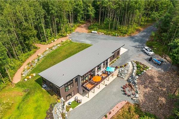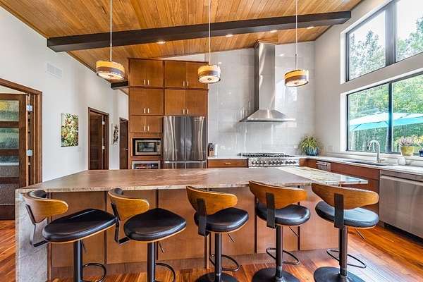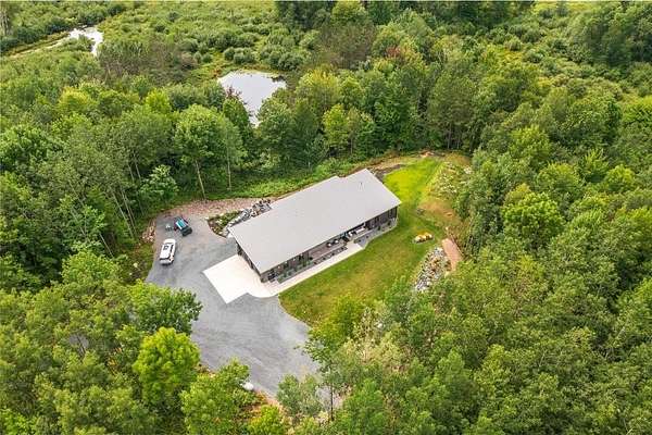 Imagine waking up each morning in a home that truly inspires. This Mid-century modern-inspired residence blends thoughtful design, high-end finishes, and exceptional craftsmanship. Nestled on 33.75 wooded acres along Washington Creek, it offers a peaceful retreat close to multiple lakes--perfect for outdoor enthusiasts. From the moment you enter, the open-concept layout and striking architectural details will captivate you. The great room boasts cathedral ceilings and expansive windows, filling the space with natural light, while patio doors create a seamless indoor-outdoor connection to a 40' composite deck overlooking the pond, and professionally landscaped grounds. The upscale kitchen is a chef's dream, featuring a spacious island, abundant cabinetry, quartz and granite countertops, a walk-in pantry, and a full coffee bar. Commercial-grade appliances, including a 60" double oven and cooktop, make this space ideal for everyday living or entertaining.