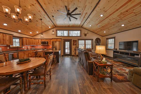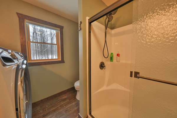 1.5-bath home was constructed with quality materials and thoughtful details throughout. In-floor heat with zoned controls keeps the cabin cozy all season long, complemented by central air, furnace, an air exchanger, and Anderson windows and doors additionally some with built-in retractable screen system.