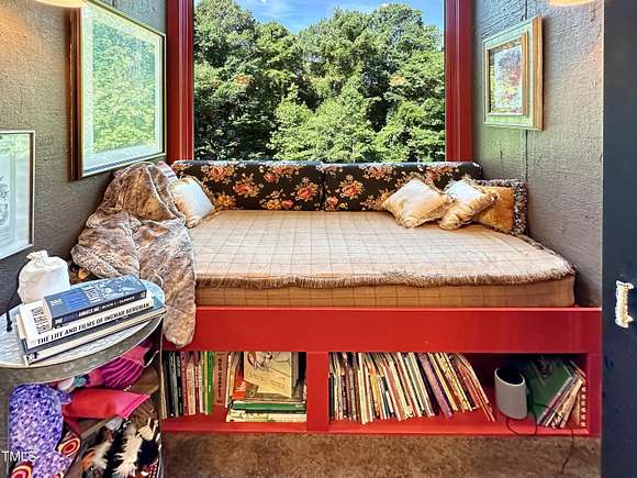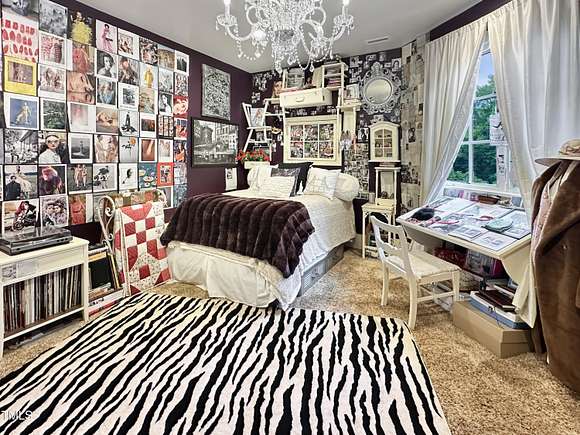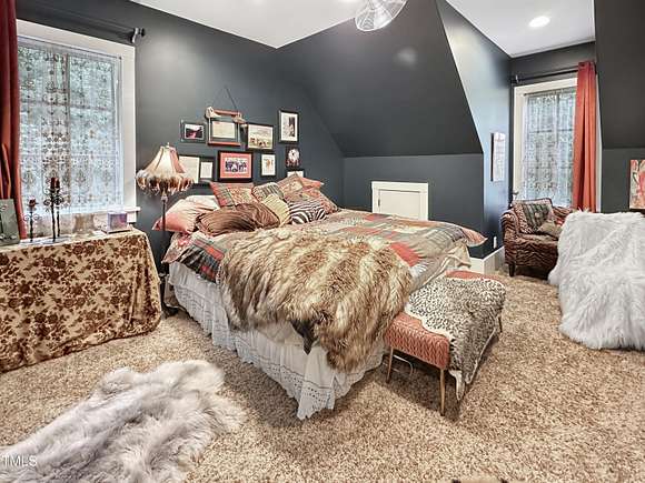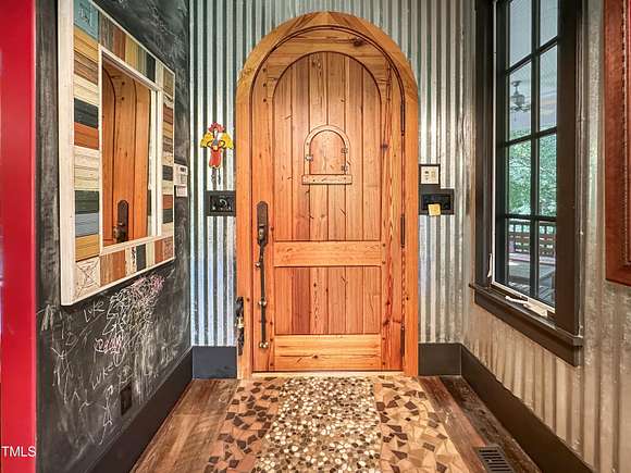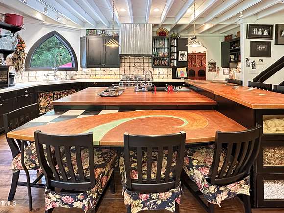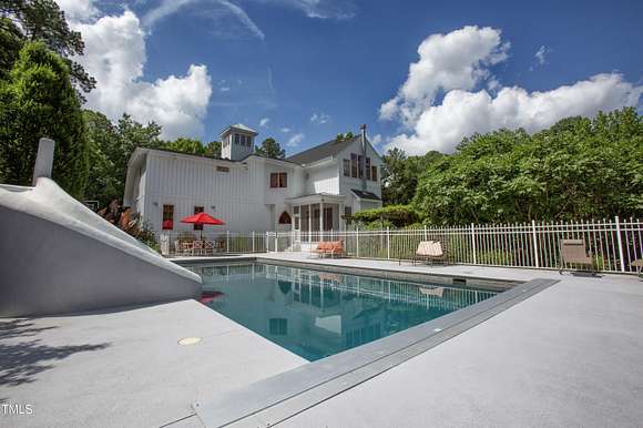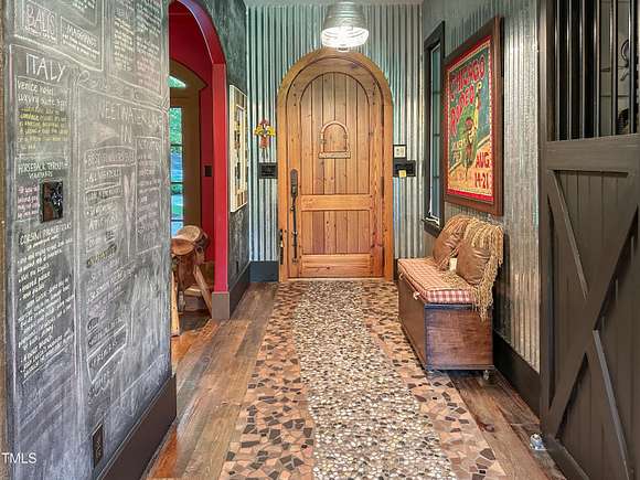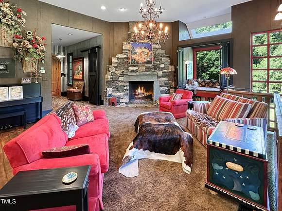 An Artist's Dream Home. This 5 Bedroom and 4.5 Bath Custom Home is full of Character and Creative flair. Nothing boring here! This home was designed with a vibe for the imaginative person who loves Free Flowing Rooms with whimsical touches. A uniquely different home surrounded by stunning landscapes. It's filled with natural wood carvings, art, and creative wrought iron accents. The home sits on 5.5 acres with stunning views of trees, open spaces, a swimming pool, a huge yard, and backs onto Falls Lake. It features an open kitchen with a bar and a sitting room with a fireplace, a craft room, an office area, and a pantry/mudroom. The second floor has a master suite, oversized bedrooms, private baths, and plenty of room to expand. The lower level includes a family room, guest bedroom, and ample storage. Enjoy a quiet walk around the grounds or to the lake. Relax on the large covered front porch or by the pool. It also offers easy access to shopping, RTP, and I-540. 360 Tour: https://momento360.com/e/u/7b297a673eca44dbbb766185ff944d24?utm_campaign=embed&utm_source=other&heading=0&pitch=0&field-of-view=75&size=large&display-plan=true
