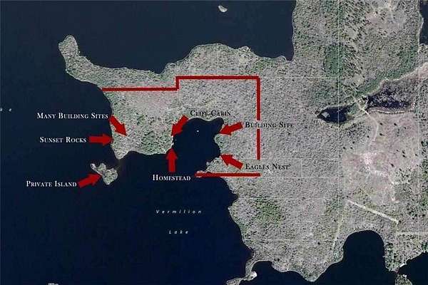 Lake Vermilion Sunset-Facing Building Lot! 4.5 acres & 302 ft gorgeous rocky shoreline commanding 2 mile sunset views--island studded blue water vistas all the way across Wakemup Bay! Gradual elevation provides choice of building sites for your cabin home nestled in this private park like forest, with easy access to the lakeshore. Short boat ride to mainland. Electricity at Lot 3. Survey & septic eval in process; sale subject to County approval. High speed internet potential via Starlink. Enjoy swimming, fishing, secluded hiking/biking/ trails, boat to championship golf and delicious dining choices. Other lots also for sale. Call today!