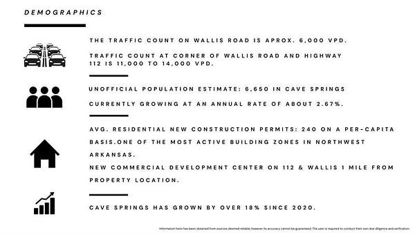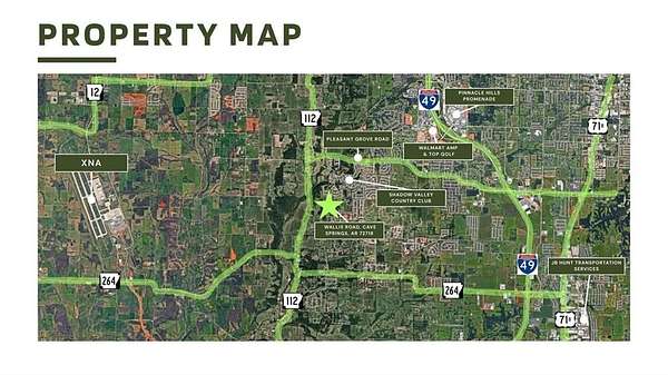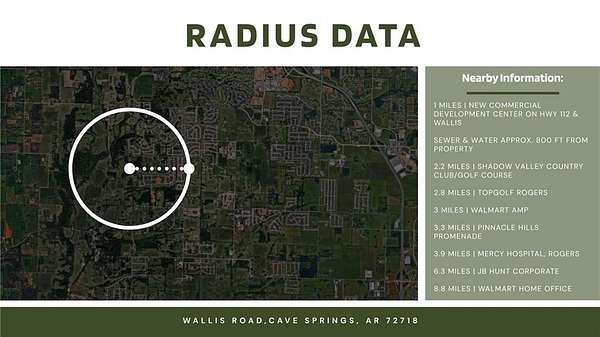 Unlock the potential of this 9.89-acre prime development tract perfectly situated off Wallis Road in the heart of Cave Springs. Located directly across from the prestigious Shadow Valley community, this gently rolling, partially wooded acreage offers a high-end suburban canvas for builders and investors alike. The property sits within the sought-after Bentonville School District, ensuring long-term value and high demand for future residential projects. With paved road frontage and a strategic location near the Hwy 112 corridor, you are minutes away from the shopping, dining, and employment hubs of Northwest Arkansas. This is a rare opportunity to secure a significant footprint in one of the region’s most rapidly appreciating areas. Secure your stake in the future of Cave Springs today.