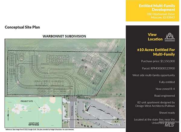 Entitled 10-acre multi-family development site located on the state line near the University of Idaho. Zoned R-4 and shovel-ready, this south-facing parcel offers outstanding views overlooking east Moscow and the U of I campus. An 82-unit apartment project has been designed by Design West Architects, with road engineering completed. The property is ideally positioned within walking distance to shopping, medical services, restaurants and a bus stop. Located between two major universities, U of I and WSU, this site benefits from strong, built-in rental demand. A prime location and entitlement-ready opportunity for an apartment developer seeking great views, walkability & close proximity to major education and employment centers. Few sites offer this combination of approvals, views, walkability and sustained rental demand.