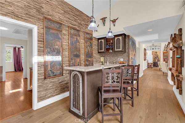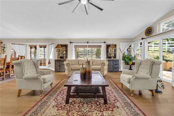 Set behind a long, automatic gated drive with panoramic mountain and Valley views, this refined Warner Springs estate delivers privacy, scale, and a seamless connection to the surrounding landscape. Thoughtfully designed for both everyday living and elevated entertaining, the property blends timeless materials with modern comfort across expansive indoor and outdoor spaces. The main residence features an open kitchen and living concept filled with natural light, highlighted by a skylight, bay window, and multiple sets of sliding and french doors that frame the views and create effortless indoor outdoor flow. With new light oak flooring, granite counters, stainless appliances, custom built ins, and a six burner range with double ovens, the kitchen anchors the heart of the home, complete with a breakfast bar open to the living space, ideal for casual gatherings. Living spaces are well defined yet connected, including formal dining, multiple living areas, and a fully screened sunroom. Several fireplaces throughout make this home perfect for year round enjoyment. The primary suite is privately situated and generously scaled, offering a spa tub, walk in closet, and separation from guest spaces for true retreat living. Outdoor amenities are designed with intention. Front and rear patios showcase a nicely landscaped setting with featured fountain and tiered elevation yard creating multiple environments for entertaining or quiet relaxation. The property is fully fenced and gated, offering both security and serenity. A detached workshop and garage structure provides flexibility for storage, hobbies, or future ADU potential. Additional highlights include Saltillo tile accents, dedicated laundry room, wet bar, new garage doors, and a three car garage partially converted and being purposed as a gym, all contributing to the property's functional versatility. With expansive views, abundant natural light, and a layout that balances openness with privacy, this is a rare offering that captures the essence of refined rural living while being minutes away from several large metro areas. Call for a private showing today!