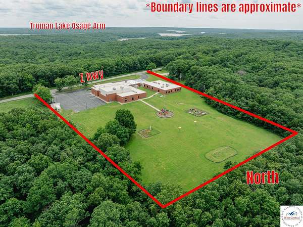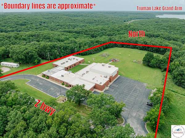 SELLER IS NEGOTIABLE FOR ANYONE INTERESTED IN ADDING MORE LAND TO THE TRANSACTION! Once-in-a-lifetime real estate opportunity in the Truman Lake area! Located in in the heart of the Ozarks between Clinton and Warsaw, sits a roughly 32,000 square foot school building on 5.9+/- acres with many updates and numerous use options. Of course, the amenities you'd expect with a school are included - such as a spacious gymnasium, full-service cafeteria equipped with a large walk-in cooler and freezer, and an abundance of classrooms, bathrooms, showers, and office spaces. Three of the classrooms have been thoughtfully converted into flexible spaces that can function as offices or living quarters, potentially offering up to 15 private spaces with bed accommodations. The fully paved parking lot ensures convenient access for students, staff, or patrons. Four newly renovated shower stalls are located in the west wing, adding to the building's versatility, along with a total of nine bathrooms, comprised of three boys, two girls, and four any gender restrooms. 12 fully functional classrooms, most equipped with water hook-ups for sink installations, and many are set up with projectors. A dedicated utility room is available with hook-ups for four sets of washers and dryers. The large library would be a great common area or game room. Many rooms throughout the facility include new flooring and modern windows, enhancing the building's overall appeal and energy efficiency. Ample storage rooms are located throughout the building, providing more than enough space for supplies, equipment, or inventory. Importantly, there is no county zoning for this property, which opens countless use possibilities for any new owner. Use as a traditional or specialized school, or convert to healthcare, event space, office space, residential, or retail.