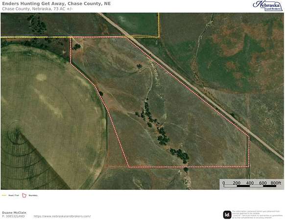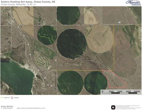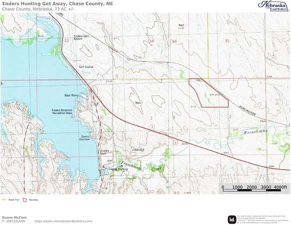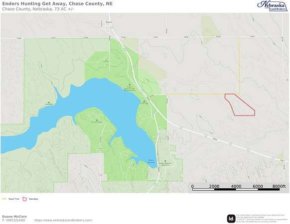 PROPERTY HIGHLIGHTS: o LOCATED EAST OF THE ENDERS GOLF COURSE AT ENDERS, NE IN SOUTHEASTERN CHASE COUNTY o LOCATED ONE HALF MILE NORTH OF THE FRENCHMAN CREEK o ACCESSED PROVIDED BY MINIMUM MAINTENANCE ROAD WITH ACCESS FROM THE WEST AND THE NORTH o TERRAIN AND TREE COVER PROMOTING WILDLIFE HABITAT o GOOD BIG GAME HUNTING AND RECREATIONAL OPPORTUNITIES o 73 TAXED ACRES o ASKING $220,000.00 This property has an array of possibilities and desirable qualities for the hunter and recreationalist and includes grazing income potential. It's proximity to Enders Golf Course and Enders Reservoir State Recreation Area makes it desirable for any outdoor enthusiast. It's vicinity to these enviable sites, it's serene traits and available rural electrical power show potential as a possible building site. Once crossed by a live water tributary that fed the Frenchman Creek, the properties topographical valley terrain and tree cover combined with the tall grass CRP fields north and irrigated cropland west of the property provide for and attract whitetail deer, mule deer and a very large population of Rio Turkey. This property's isolation provides a great harbor for the wildlife. As indicated by the provided maps, this property is located 1.5 miles east of US Highway 6 on 732 Road. The last mile of the open road is a two-track trail road. Access from the north is also available via an open road from 733 Road to a railroad crossing off the northeast corner of the property. The railroad tracks form the easterly boundary of the property. While some maps show access to the property at the southeast corner, there is not a public access and continued access would have to be addressed with the neighbor. Should grazing livestock be your interest, this property has complete perimeter fencing, an electric well and stock tank. The owner has rated the property to carry 10-12 cow calf pairs during a normal rainfall year. This property is located in a region with a large amount of potential and is an opportunity worth looking into! LEGAL DESCRIPTION: TOWNSHIP 5 NORTH- RANGE 37 WEST OF THE 6TH P.M., CHASE COUNTY, NEBRASKA. Section 2: Part N1/2NW1/4 and N1/2S1/2NW1/4 ACRES: 73 ASSESSED ACRES LOCATION: FROM THE US HIIGHWAY 6 AND ROAD 339 INTERSECTION SOUTH OF ENDERS, NE, GO EAST 1/2 MILE AND THEN FOLLOW THE ROAD AS IT BECOMES A TWO-TRACK TRAIL EAST 1 MILE FROM THE US HIGHWAY 6 AND ROAD 733 INTERSECTION AT ENDERS, GO EAST 2 MILES AND THEN SOUTH ON TWO-TRACK TRAIL ROAD (AVE 340) FOR 1 MILE, THEN TURN WEST. THE PROPERTY IS JUST WEST OF THE RAILROAD CROSSING. TAXES: 2024 Real Estate Taxes Payable in 2025 $348.64