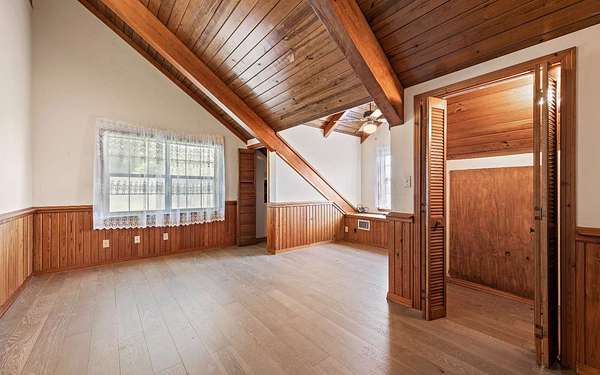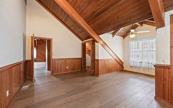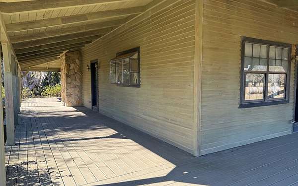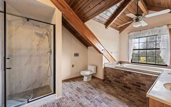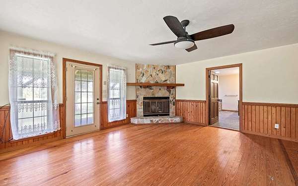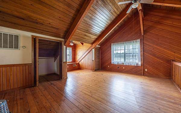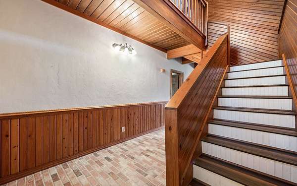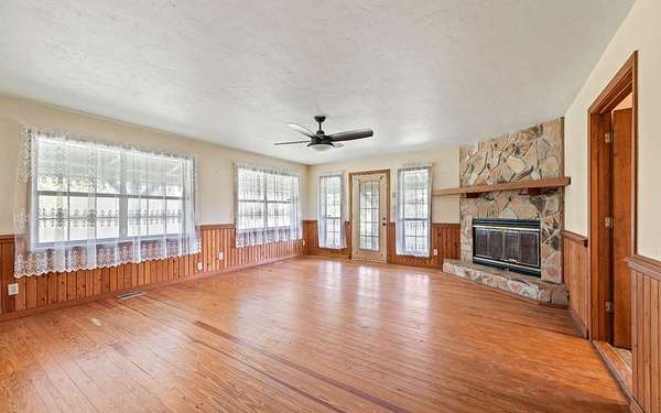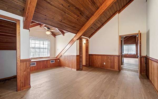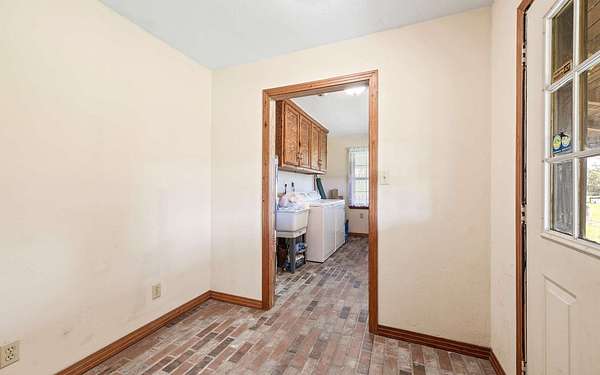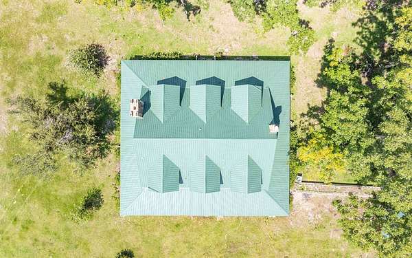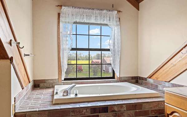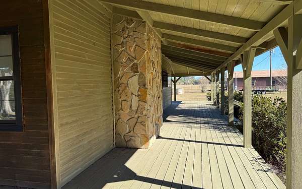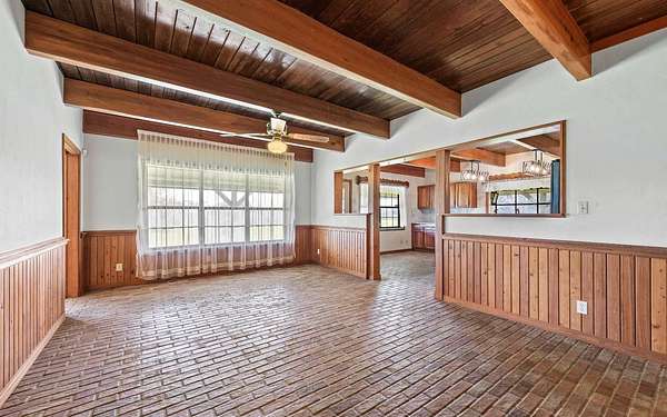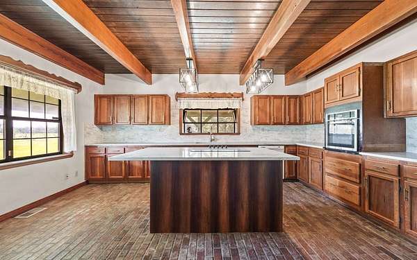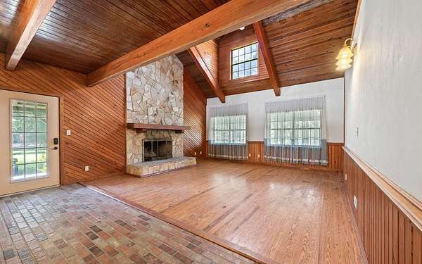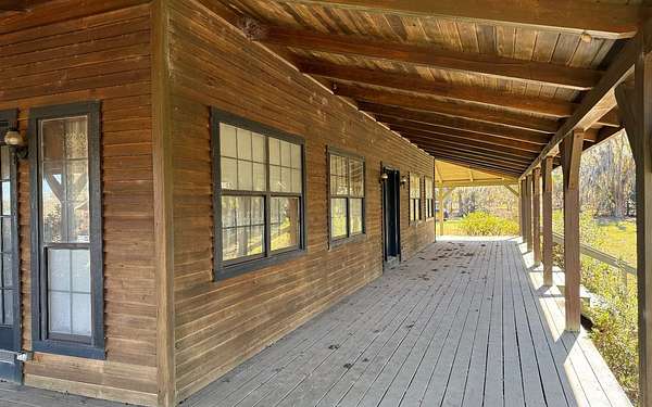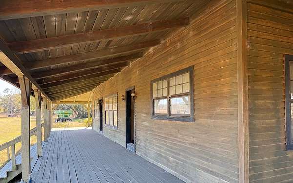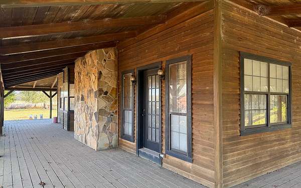 This beautifully crafted home offers over 2,800 sq ft of heated living space, plus a spacious loft, all surrounded by serene pastures and mature woodlands. Step inside to find stunning exposed wooden beams, rich brick flooring, and a warm, inviting atmosphere throughout. The living room features a grand wood-burning stone fireplace, while the expansive master suite offers a second fireplace for added comfort, along with a huge walk-in closet. The kitchen has been thoughtfully updated with new countertops and backsplash, blending rustic charm with modern function. Enjoy peaceful mornings and sunset evenings from the full wraparound porch, perfect for entertaining or quiet relaxation. The property also includes a two-story horse barn and a large equipment barn with roll-up doors and a built-in restroom--ideal for agricultural or recreational use. Wildlife is abundant, and the land offers the perfect balance of open pasture and shaded hardwood areas.
