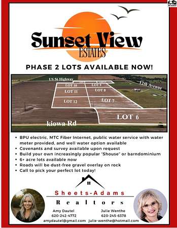2nd Phase of Sunset View Estates is NOW open for sale! Want to get out of town with space to breathe and have a great view of the beautiful Kansas sunsets, then here is the country sub-subdivision for you. 2 lots on Sunset Trail and 6 lots on Westview Lane with 6+ acres are ready for your dream home. Shouse's and Barndominiums welcome! Don't want overly restrictive covenants or expensive HOA fees, neither do we, that's why there are No HOA fees and up to 2 horses and 10 chickens per homestead welcome. BPU electricity on-site (at no expense if lines are overhead), MTC fiber-optic internet on-site, rural water meters provided on-site or option for a water well. Rock roads with gravel overlay to be installed which will provide for minimal dust and nice surface for those evening walks. 1 mile west of McPherson Kansas. Lot #7 is 5.99 acres.