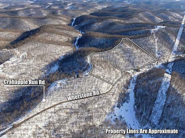 The property features frontage on both Crabapple Run Road and Whetstone Road, providing easy access and flexibility. A small area of level ground on a ridge knoll along Crabapple Run Rd offers a potential location for a cabin or recreational camp, subject to buyer verification. An electrical transmission right-of-way runs along the northern boundary, with residential electric service available nearby.
