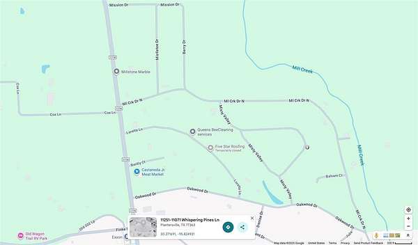 From FM 1774, turn onto Whispering Pines Ln. Continue down the dirt road until you reach the lot near Todd Mission.