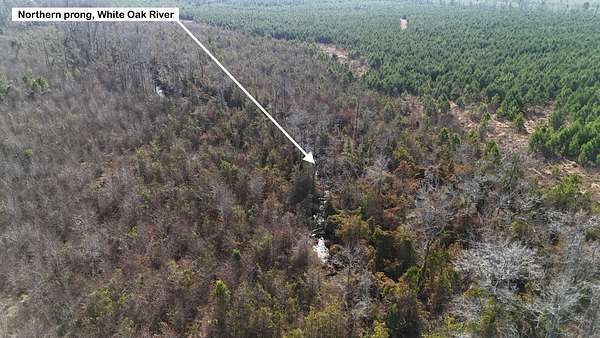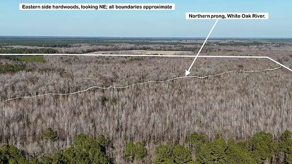 Approximately 160 acres of well-established upland support planted pine timber estimated at 6 years old, providing future income potential. The balance of the land lies within the scenic White Oak River pocosin, featuring impressive mature hardwoods, including cypress, oak, and gum. Both the northern prong and southern prong of the White Oak River flow through the property, enhancing habitat quality and creating a stunning natural setting.