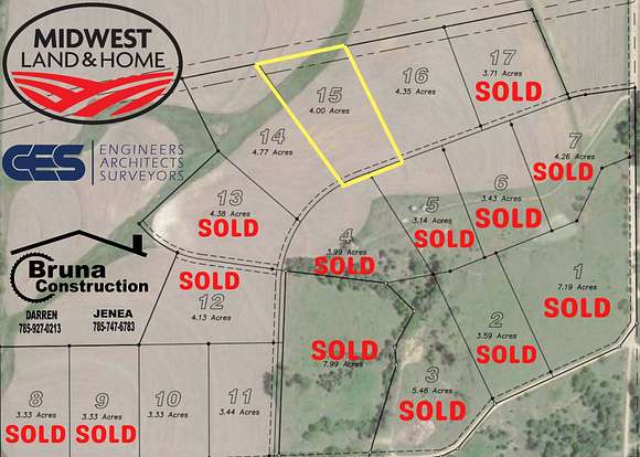 LOTS FOR SALE - Little Blue River Estates Subdivision - Lot 15 Do you desire a small acreage to build your dream home? LOOK NO FURTHER! Little Blue River Estates Subdivision has lots ranging in size from 3.33 acres to 4.77 acres available waiting for you! This development is conveniently located outside Hanover, KS and reasonably priced at $10,000 per acre. It offers the perfect pair of serene country living with the convenience of living close to town. Legal Description: Little Blue River Estates, S07, T02, R05, ACRES, Lot 15, Little Blue River Estates LESS RD ROW, Washington County, Kansas Property Location: From Hanover, KS head West on Hanover Avenue half mile to Yankee Road. The intersection of Hanover Avenue and Yankee Road is the Northeast corner of the property. Available Lots: 15 - 4.00 Acres Attributes: Currently outside city limits No HOA Custom stick built homes (no modular or prefabricated homes) 1,800 square feet minimum of living space on the main floor Up to 3,000 square feet of out building space allowed No animal restrictions (must be fenced or caged) No exclusive builder Utility easement Amenities: Electric - Bluestem Gas - Propane Rural Water Internet - BlueValley Technologies Sewage - Septic or Lagoon Pictures and property lines are illustrations only and not guaranteed to be actually property lines.