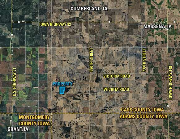 From Cumberland, Iowa: Travel directly south on 690th Street, while crossing Iowa Highway 92, for 5.75 miles to Wichita Road. Turn right (west) and continue for 2 miles, and the property is located on the south side of the road. Look for the Company sign.