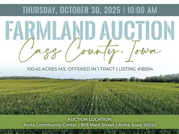 Cass County, Iowa Farmland Auction - Mark your calendars for Thursday, October 30th, 2025, at 10:00 AM! I'm proud to represent the sale of 100.45 gross acres m/l, being offered as a single, highly tillable Cass County farmland tract situated southwest of Cumberland, Iowa. This farmland tract is comprised of a gentle rolling topography located within the northwest quarter of Section 29 and northeast quarter of Section 30 of Edna Township, Cass County, Iowa. This tillable farmland tract consists of 100.45 acres m/l with 100.45 FSA tillable acres carrying a CSR2 of 82.1, although currently there is only 78.97 planted acres. The FSA tillable acres consist of Nodaway-Kennebec complex as the primary soil type, with lesser percentages of Sharpsburg silty clay loam and Zook silty clay loam. This tract is improved with substantial tract cleanup. The West Nodaway River meanders through the northeast corner, flows along the eastern edge, and is adjacent to the southern property boundary, and tile can be taken to daylight through this creek. Ideally situated in the south central portion of Cass County, Iowa, this farmland tract would be a smart investment for a beginning farmer, Buyer looking to diversify their portfolio, or anyone interested in a long-term land investment opportunity. The farm will be sold to an existing cover crop lease through February 28th, 2026, and will be offered on a price-per-acre basis at a live public auction on Thursday, October 30th, 2025.