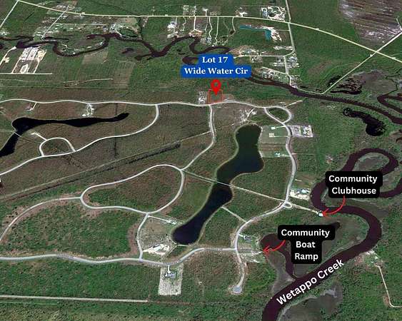1.65-acre homesite in gated Wetappo community Private boat ramp to Wetappo Creek 10 minutes to Mexico Beach Lot 17 Wide Water Circle offers 1.65 acres within Wetappo, a 400+ acre gated community in Wewahitchka. Homesites range from approximately 1 to 3 acres, providing space between residences while maintaining a cohesive neighborhood design. Residents have access to a waterfront community lodge overlooking Wetappo Creek featuring a screened gathering area and floor-to-ceiling stone fireplace. The private community boat ramp and dock provide direct access to Wetappo Creek for kayaking, boating, and fishing. Additional community features include walking trails and two private lakes within the development. The location offers a natural setting while remaining approximately 15 minutes from Mexico Beach and Gulf access. Opportunity to build a primary residence or second home in a gated creekfront community with water access, preserved natural surroundings, and proximity to coastal amenities.