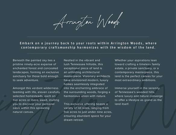 Exclusive Opportunity to own 5.04 acres of pristine land in the scenic rolling hills of Arrington, Tennessee. Introducing Arrington Woods, the area's newest and most prestigious gated community. This lot is one of only 11 expansive 5+ acre homesites, nestled across 90 acres of beautiful, wooded terrain, offering a perfect blend of natural beauty, privacy, and tranquility. The land has already been perked for up to 5 bedrooms, providing flexibility to design your dream home. At Arrington Woods, you have the option to bring your own builder or select from a curated list of premier preapproved builders. Conveniently located near I-840, Arrington Vineyards, historic Downtown Franklin, and Murfreesboro, this property offers the ideal balance of serenity and accessibility. Arrington Woods combines contemporary craftsmanship with the timeless allure of the land, creating an exclusive sanctuary like no other.