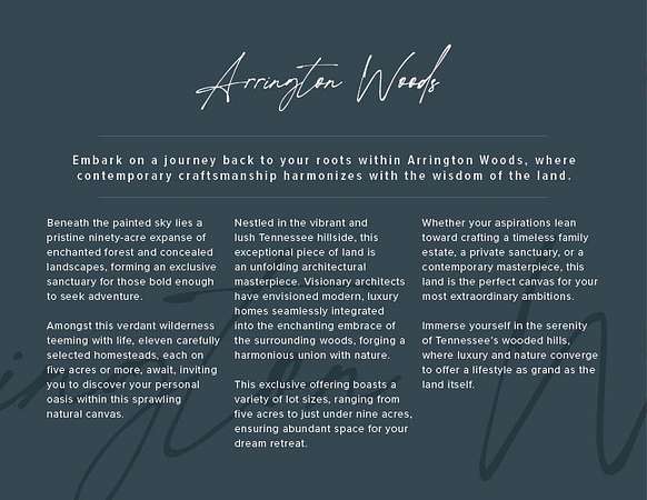 Unique opportunity to own 5.02 acres of pristine land in the rolling hills of Arrington, Tennessee, marking the debut of Arrington Woods, the area's newest and most prestigious gated community. As 1 of 11 pristine 5+ acre homesites nestled across 90 acres of picturesque, wooded land, this lot offers a unique blend of natural beauty and creates a serene and private backdrop. This particular parcel of land has already perked for up to 4 bedrooms offering flexibility in designing your dream home. Arrington Woods allows you the freedom to bring your own builder or choose from a select list of premier preapproved builders. Situated conveniently near I-840, Arrington Vineyards, historic Downtown Franklin, Arrington, and Murfreesboro, this property promises the best of both worlds - tranquility and accessibility. At Arrington Woods, contemporary craftsmanship meets the wisdom of the land creating an exclusive sanctuary.
