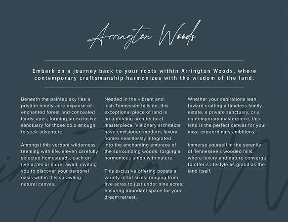Ideally located near I-840, Arrington Vineyards, historic Downtown Franklin, and Murfreesboro, the property offers a peaceful retreat with convenient access to everyday amenities. Combining timeless natural landscapes with refined exclusivity, Arrington Woods presents a truly unparalleled opportunity to create your forever home in the heart of Williamson County.