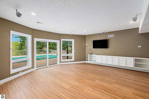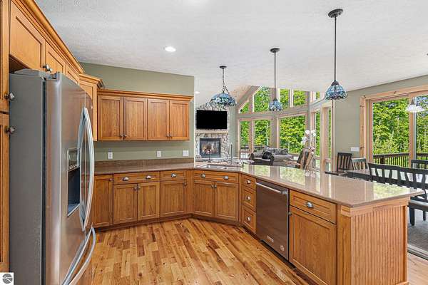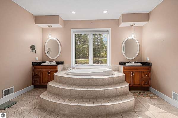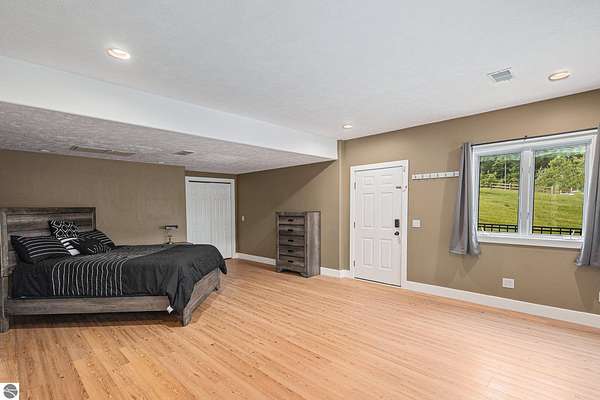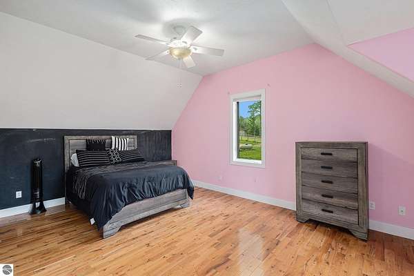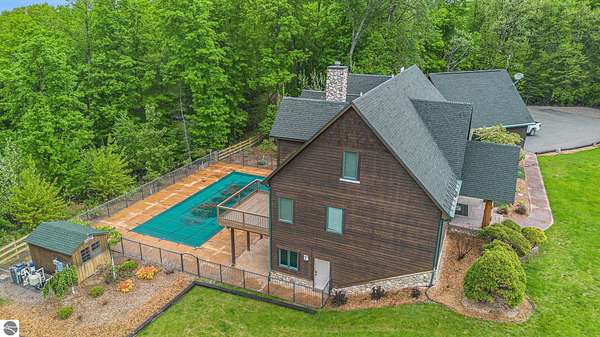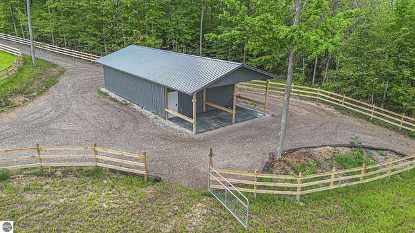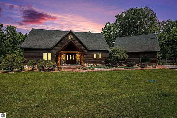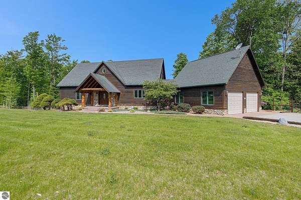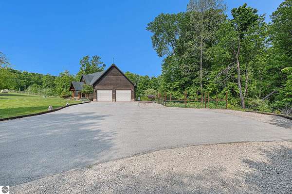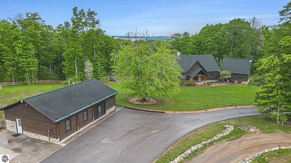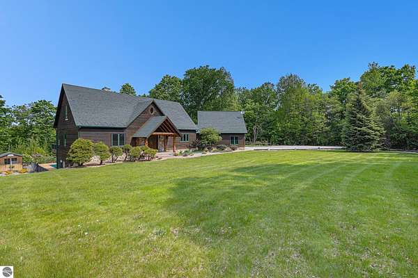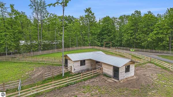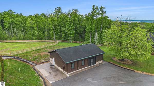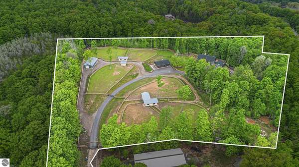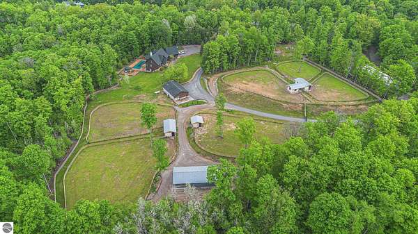 Discover an exquisite 4,700-square-foot sanctuary at 5575 M-72, nestled on nearly 10 acres of private, hardwood-laden land bordering state property. This meticulously crafted five-bedroom, three-and-a-half-bathroom residence blends luxurious interiors--featuring white pine and cedar accents, a gourmet kitchen with granite countertops, and in-floor radiant heat--with exceptional equestrian amenities, including a fully fenced perimeter, three professionally cleared paddocks, and run-in stalls. A 42-foot heated pool, detached bunkhouse with three bedrooms and a full kitchen, and advanced mechanical systems, such as a Generac generator and ice melt roof, enhance functionality, while a pole barn, attached two-car garage, and professionally landscaped gardens complete this serene retreat, perfect for equestrian enthusiasts seeking modern elegance and boundless potential. Just 10 Minutes from the Traverse City Horse Show!