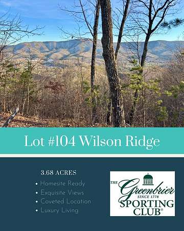 Est $5,281/moExperience Unparalleled Luxury Living in The Greenbrier Sporting Club - Situated on 3.68 acres of picturesque, wooded slopes, Lot #104 Wilson Ridge boasts breathtaking Allegheny vistas from every angle. Overlooking the renowned Greenbrier Resort, golf courses, equestrian stables, and adjacent to designer estates, this homesite offers you the perfect canvas for your own bespoke dream haven in one of the most desirable residential enclaves available.
