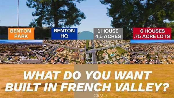 The Sunset Ranch on Benton prevents ample opportunities. Currently zoned for a single-family home on 4.36 Acres, this property may present an opportunity for rezoning through the county of Riverside. Whether you are potentially subdividing into several smaller lots, hoping for a live and work environment, looking at the Sunset Ranch for the next city or county development project, or for the possibility of commercial revenue, The Sunset Ranch on Benton is centrally located on Benton Rd, the closest thing to a "Main Street" in French Valley. Benton Rd runs through French Valley, becoming Clinton Keith at the 79S, eventually hitting both the 215 and 15 Freeways.The property is also close to housing, shopping, and commercial development, and is mostly flat and usable. It sits in the heart of French Valley, on the Main Street, in an unincorporated community of Winchester, California. This area sits in the highly desirable Temecula Valley Unified School District.Here are some possibilities to consider if rezoning is achieved through the county. Renderings have been provided in the pictures. Option 1: "Benton Park" would follow the layout of several 5-acre parks throughout the country, with an amphitheater, playground, walking trails, and a skate park. This would be a great place for French Valley residents to gather with friends and family, or for community events. I'd love to see the County of Riverside, or the City of Temecula, make this possible. Option 2: I call it "Benton Headquarters", a shopping center like Vail Headquarters in Southern Temecula, which features several smaller local shops, bringing back opportunities for residents, local shopping, food, fun, performances, and music. Building community and memories, while generating commercial revenue for ownership. Or Option 3: "Housing" Keep this as a single-family home for one family on a large lot, or multiple families, subdividing into 6 lots, each about 3/4 of an acre. These homes would feature Temecula Valley Schools, large flat usable lots, and would be walking distance from parks, restaurants, and shopping. Perfect for a family compound, or a smaller developer. For a property like this one, the possibilities are endless. Everything would have to be approved, permitted, and rezoned with the county, but an opportunity like this only comes along - once in a great while...It would be nice to see something good for French Valley, and the people who live here.