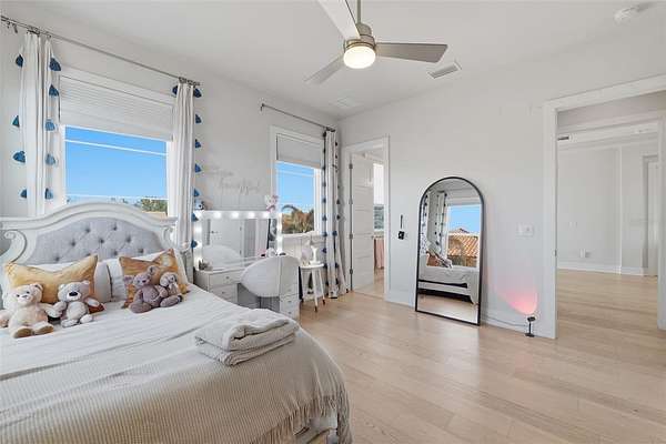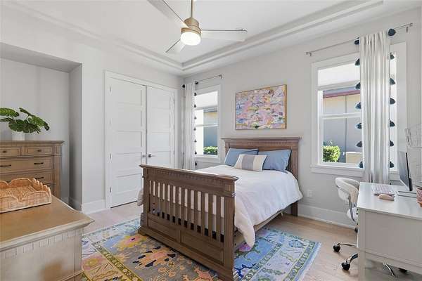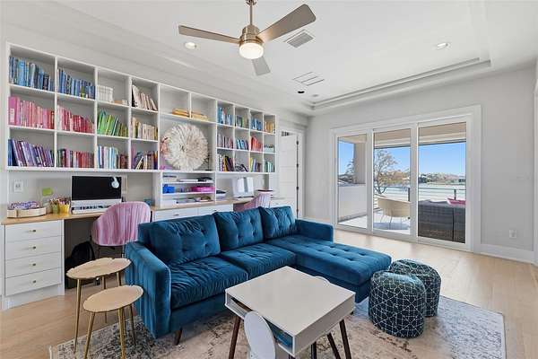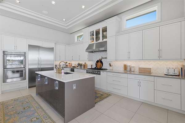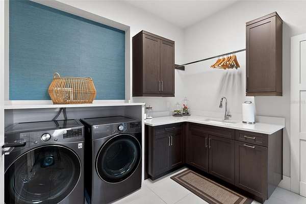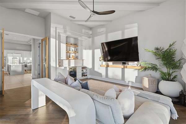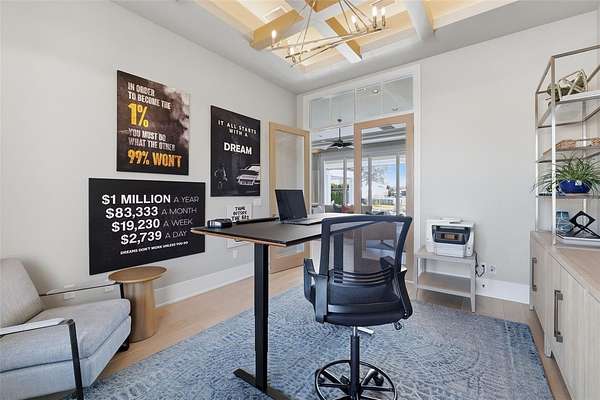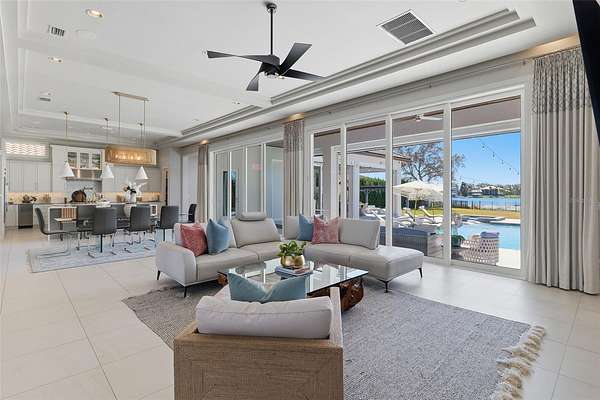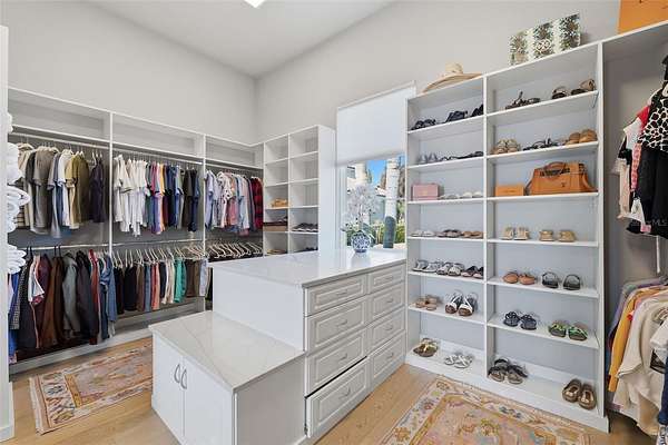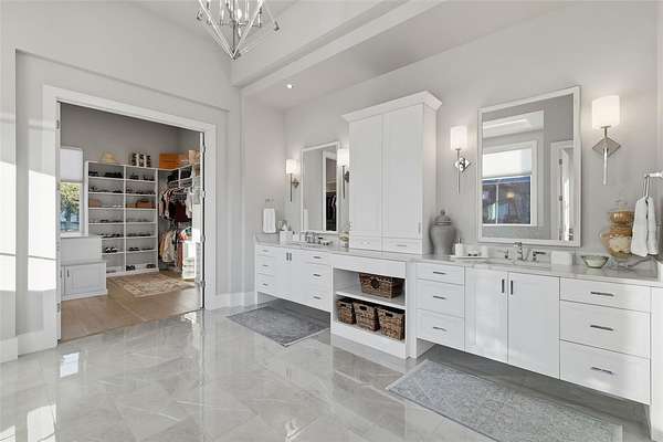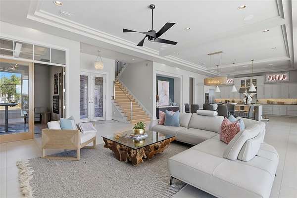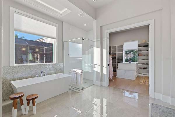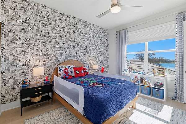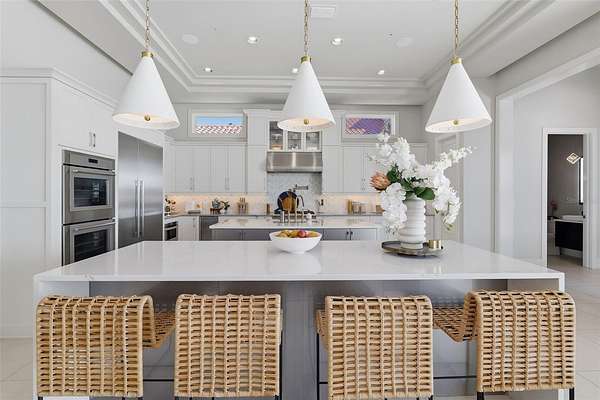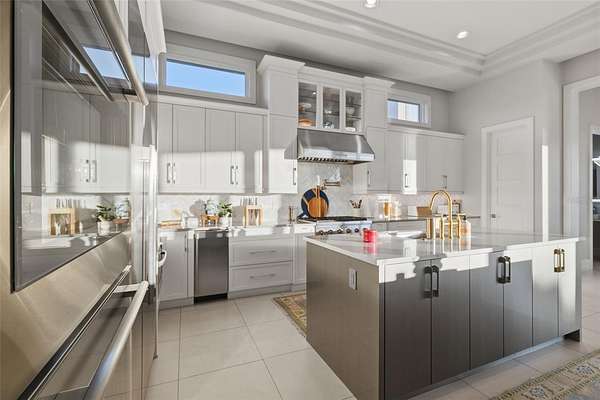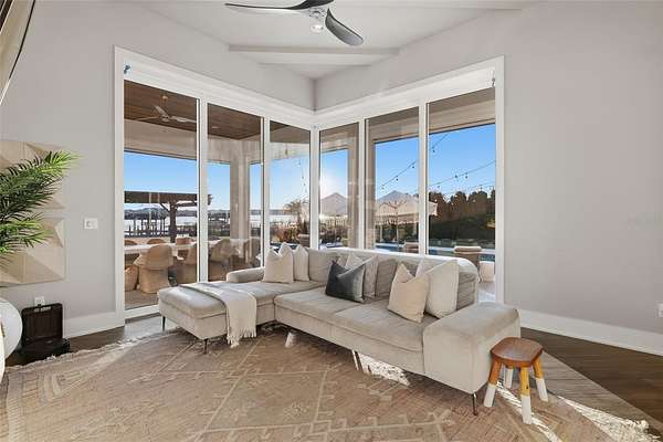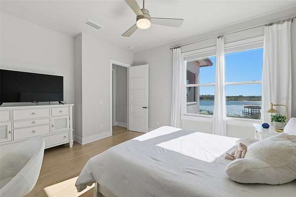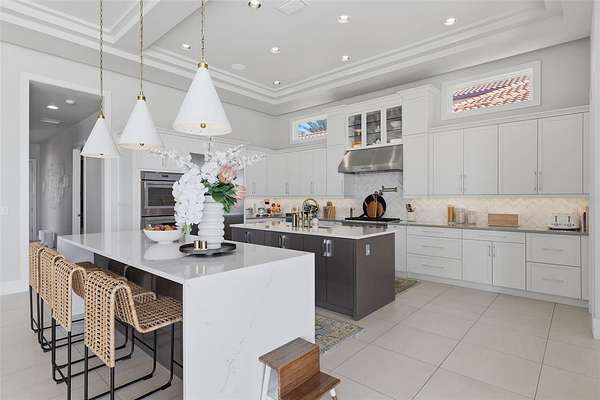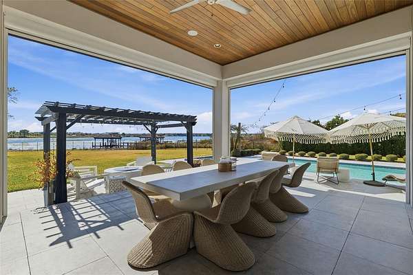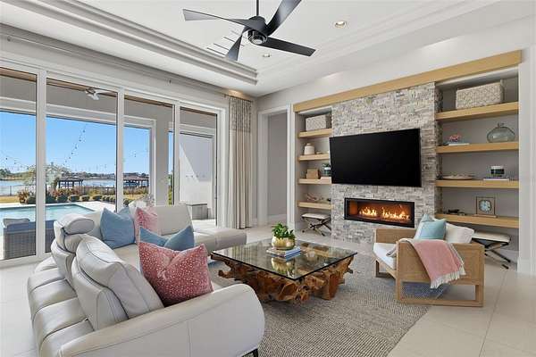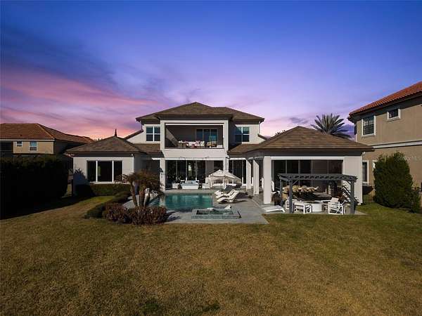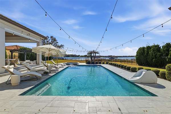 Luxury meets laid-back lake living on Lake Hancock in Winter Garden, inside the sought-after Independence community with parks, trails, and a true neighborhood feel. Custom built by Brierhill Homes, recognized as MCBC Builder of the Year, and professionally designed/furnished by Gilmore Design Co., this exceptional direct lakefront residence sits on one of the area's largest lots--with an oversized, fully fenced backyard--perfect for entertaining--where you can enjoy stunning sunsets over the water and catch the Disney fireworks on select nights. Arrive via an impressive circular drive and step into a striking entry featuring a custom front door, polished natural stone flooring, and a dramatic stone accent wall--framed by a deep, covered front porch with a rich wood-plank ceiling that immediately sets the tone. It's a welcoming space that's perfect for a small seating area to enjoy morning coffee or greet guests in style. Inside, the home is bright, elevated, and designed for both entertaining and everyday comfort, highlighted by a timeless coastal-modern palette with white oak flooring, a beautiful white oak staircase with integrated LED lighting under each step, and custom ceiling details throughout (including soffit/tray accents and integrated lighting). The layout offers 5 bedrooms, each with a private en-suite bathroom and walk-in closet, and each bedroom includes blackout honeycomb shades for comfort and privacy--including a stunning first-floor primary suite with serene lake and backyard views, plus a dedicated first-floor guest suite. You'll also love the private office and a media room that easily works as a flex space (playroom, gym, second lounge, or homework room). At the heart of the home, the chef's kitchen showcases Thermador appliances and a show-stopping double island topped with Cambria quartz with subtle gold veining, plus a custom chevron-designed backsplash with under-cabinet LED lighting that highlights the detail beautifully. The kitchen flows seamlessly into the main living space for true indoor-outdoor living. A wall of living room sliding glass doors opens wide, creating one expansive space that connects the interior to the lanai, pool, and lake beyond. Enjoy built-in Sonos sound in the living room and kitchen, with audio extended to the outdoor kitchen as well--plus the flex/media space is pre-wired if additional speakers are desired. The living room also features a sleek gas fireplace framed in natural stone, flanked by custom built-ins for a clean, designer finish. Out back, unwind in your private retreat with a heated pool and spa, generous covered areas, and a summer kitchen made for sunset dinners. The first-floor lanai (including the summer kitchen) and the second-floor balcony are both fully encapsulated with motorized screens controlled by remote--perfect for effortless, bug-free evenings and both outdoor living areas feature a warm wood-plank ceiling accent that brings a high-end, resort feel. Additional highlights include a whole-home water softener/filtration system (low/zero maintenance), a built-in security system with exterior cameras, built-in Sonos audio, and whole-home smart lighting with keypad controls and scene presets--plus an oversized 3-car garage. Select furniture may be purchased separately upon request.