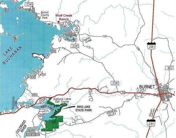From Burnet, West on Hwy 29 three miles, turn North on 2341 nine miles to Gated Entrance. Must have gate code & map. No signs allowed.